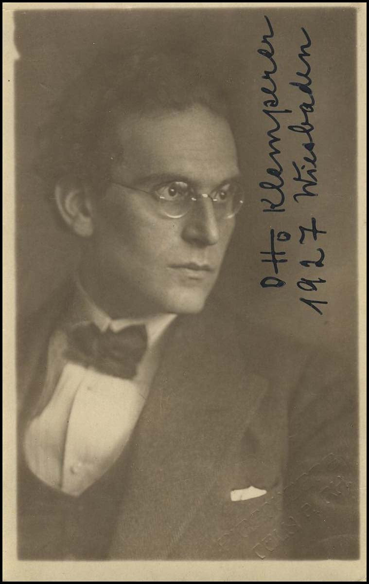 Klemperer, Otto. (1885–1973). Early Signed Photograph. Signed sepia A. Strauch of Wiesbaden bust portrait photograph the German-born conductor and composer. 8.75 x 14 cm. Signed "Otto Klemperer / 1927 Wiesbaden" in the final year of his tenure as First Kapellmeister of the Wiesbaden Opera House (1924-27). Sold together with a letter of provenance from the daughter of musicians who worked under Klemperer's baton. In crisp, fine condition, this is a remarkable and uncommonly early signed photograph of Klemperer who is rare in signed photographs of any period.