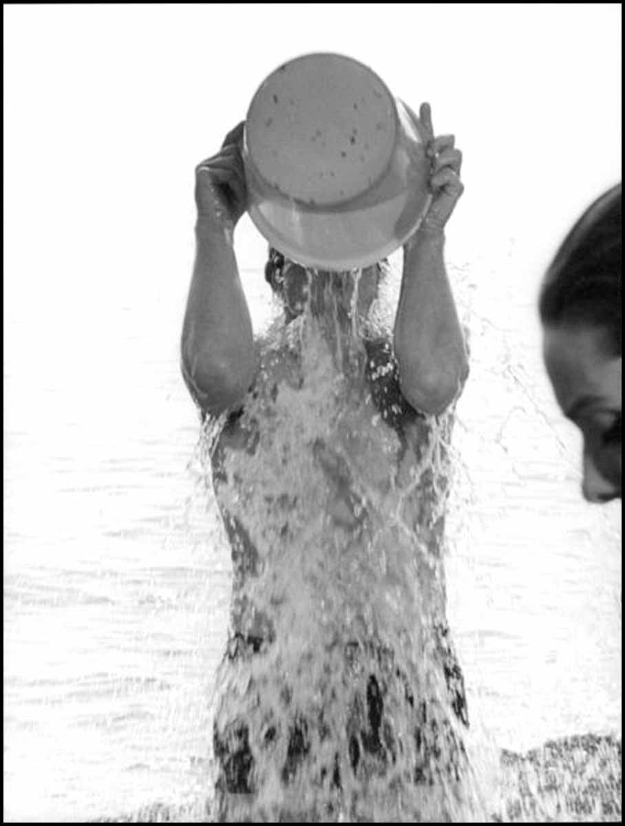Unusual approx. 7 x 9.5 inch photograph of the beautiful actress, here shown peeking into the right side of the image, while in the center of the frame a man pours a bucket of water over his head. Fine.
