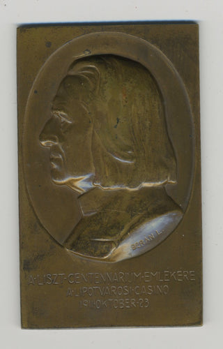 Liszt, Franz. (1811–1886). Centenary Portrait Medal, 1911. Bronze uniface portrait medal/plaque of the Hungarian virtuoso pianist and composer, by Beran [L]ajos in honor of the Liszt centenary celebration at the Lipótváros Casino in Budapest. 48 x 80 mm, a little rubbed, a few small scratched, but overall in very fine condition.