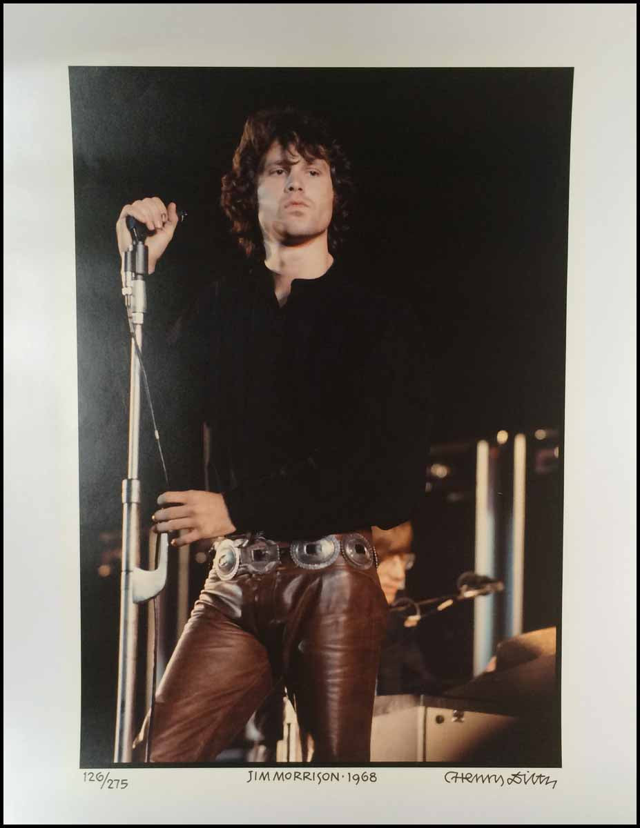 Tremendous original color photograph of Jim Morrison of the Doors in his trademark leather pants during a performance at the Hollywood Bowl on July 5, 1968. A live album recorded that evening was eventually released in 1987. Signed and numbered 126 of the edition of 275 prints. 16 x 20 inches.