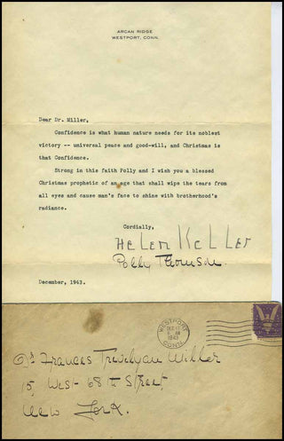Typed letter signed, Arcan Ridge, Westport, Conn., December 1943, to Dr. [Francis] Miller, 'Confidence is what human nature needs for its noblest victory - universal peace and good-will, and Christmas is that Confidence. Strong in this faith Polly and I wish you a blessed Christmas prophetic of an age that shall wipe the tears from all eyes and cause mans' face to shine with brotherhood's radiance', signed in pencil 'Helen Keller' and directly beneath in ink 'Polly Thomson', two small spots and light marginal toning, one page, small folio, together with original stamped and postmarked envelope dated 17 December 1943, addressed to Dr.Miller in New York in her assistant Polly Thomson's holograph.