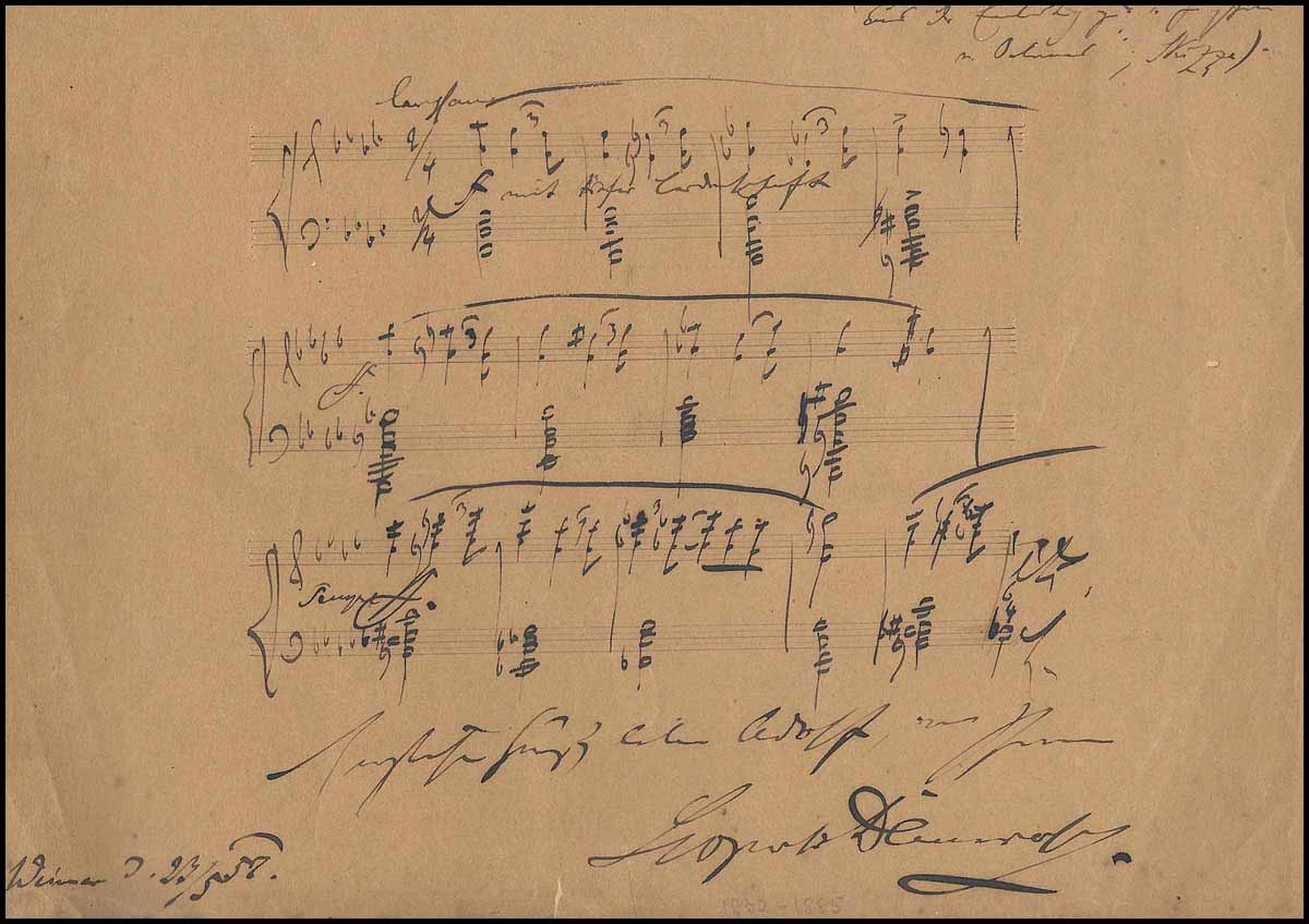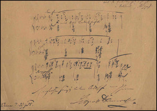 Damrosch, Leopold. (1832 - 1885). Autograph Musical Quotation. A detailed and lengthy AMQS from the German American violinist, orchestral conductor and composer. Fourteen measures scored for piano and marked "Langsam," signed and inscribed and dated Weimar, 23/5/[18]58. 11.8 x 9.4 inches. Toned, overall fine.