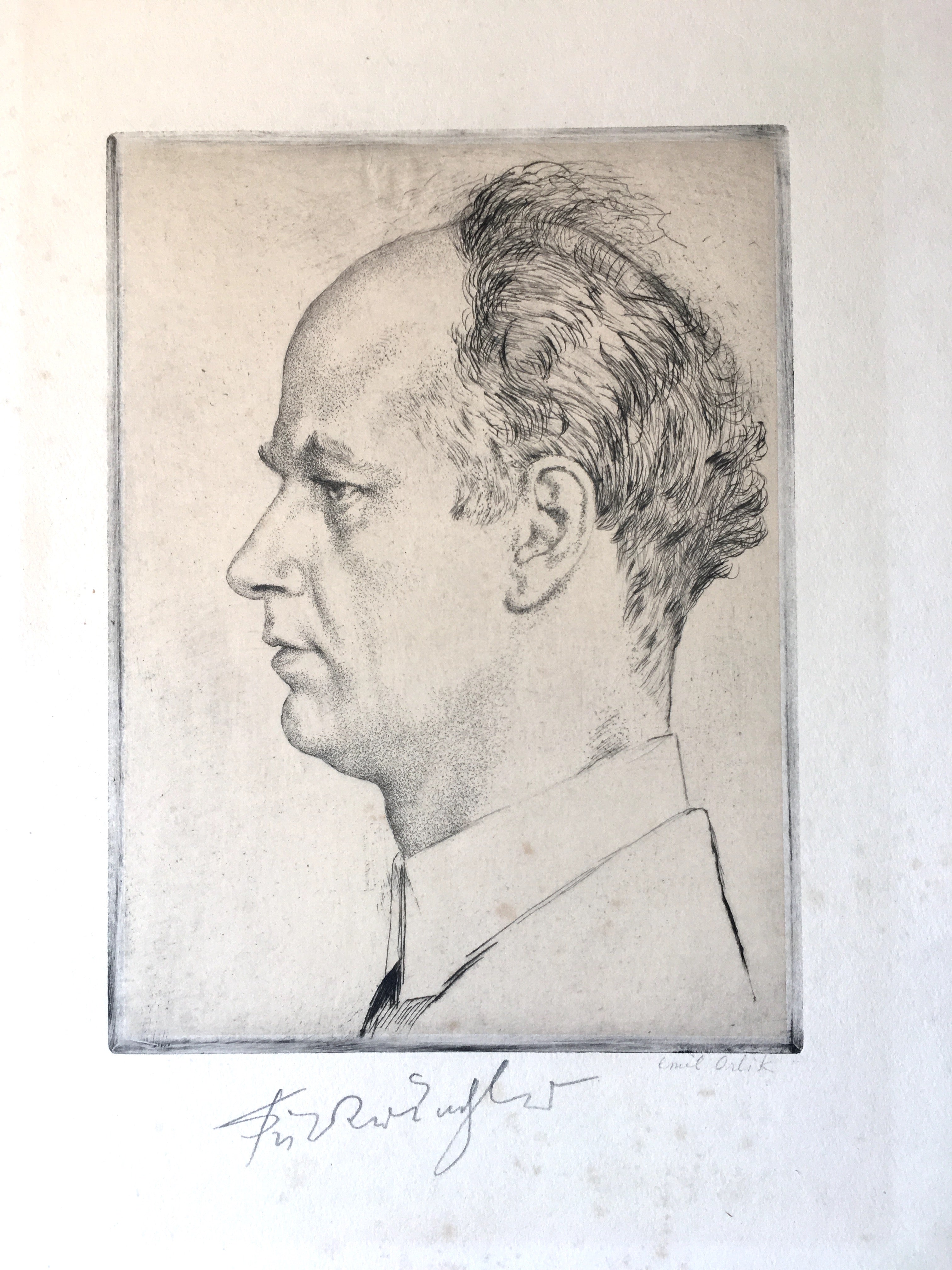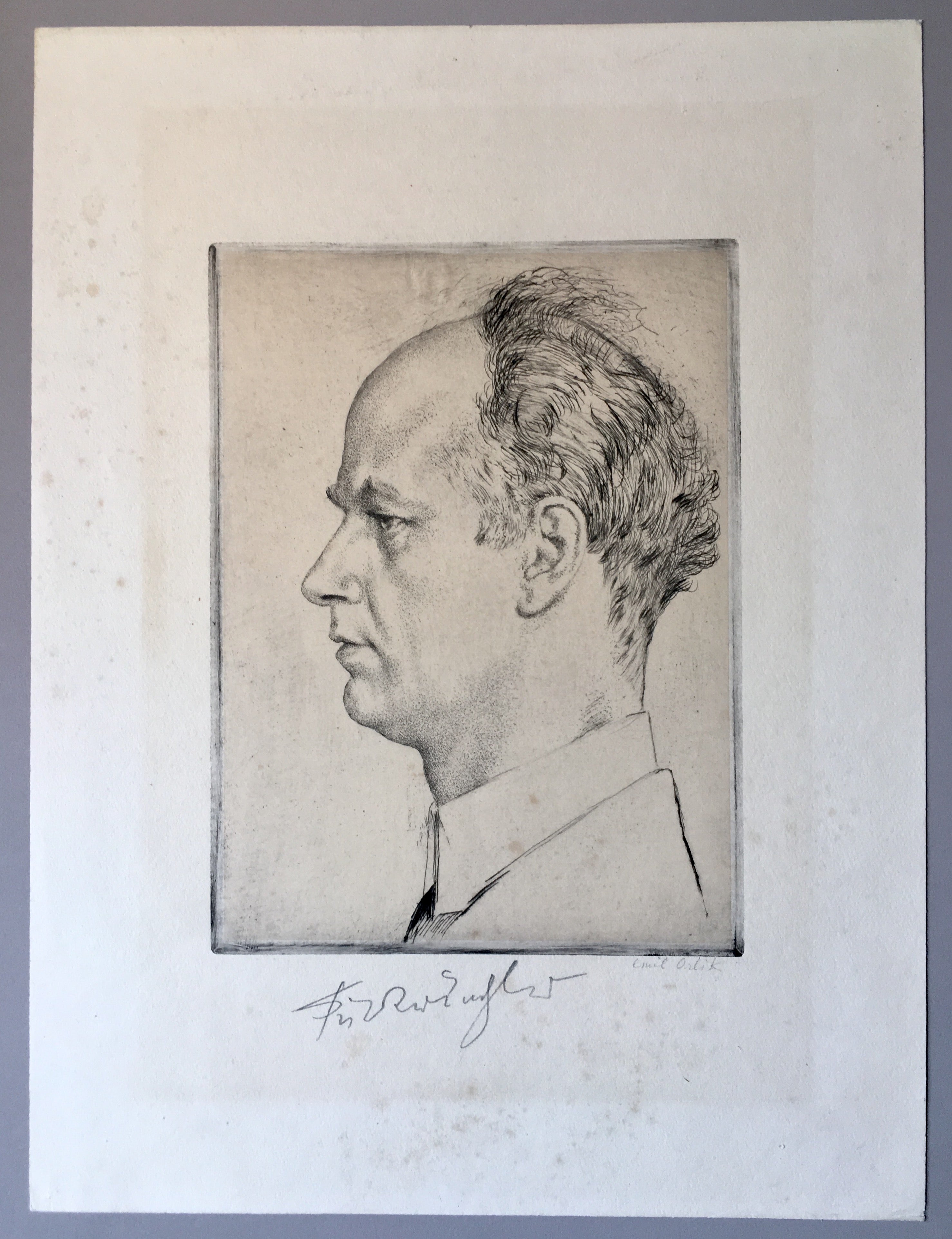 Original 1928 portrait etching of the renowned conductor, signed by its creator, the acclaimed Czech-Jewish artist Emil Orlik and by the conductor himself, "Furtwangler." On handmade paper, the full sheet 30 x 39.5 cm, portrait approx. 18 x 24 cm. In very good condition, with a subtle block of toning, scattered foxing spots and a few creases at left top margin.