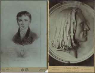 Two original cabinet photographs by Louis Held, ca. 1886. The first is a photograph of a lithograph from Villain after the 1822 drawing by Rochas which was in Liszt's home: "François Liszt, aged 11" with the caption: "Assemblage étonnant de génie et d'enfance - Il a devance l'avenir - Et dans l'âge de l'espérance - Fait déjà naître un souvenir." Small bend bottom left, else fine. The second is of a portrait medal of the composer shown in bust profile. Each approx. 16.5 x 11 cm.