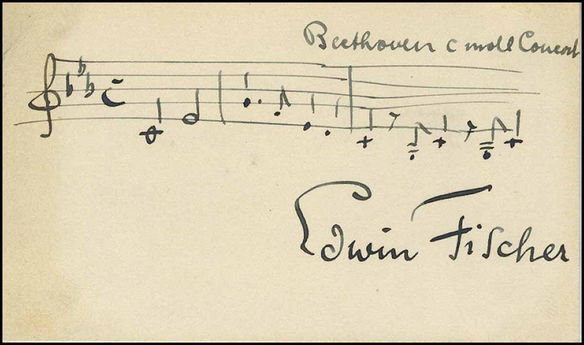 Very fine AMQS from the great Swiss pianist, the first to record The Well-Tempered Klavier. A probing interpreter, he wrote that "our aim should not be pure soil and sterile air in which nothing will grow." Fischer has here penned three measures, the opening of the 1st movement of the 3rd Beethoven Piano Concerto. In fine condition. 10 x 6 cm on a blank visiting card.