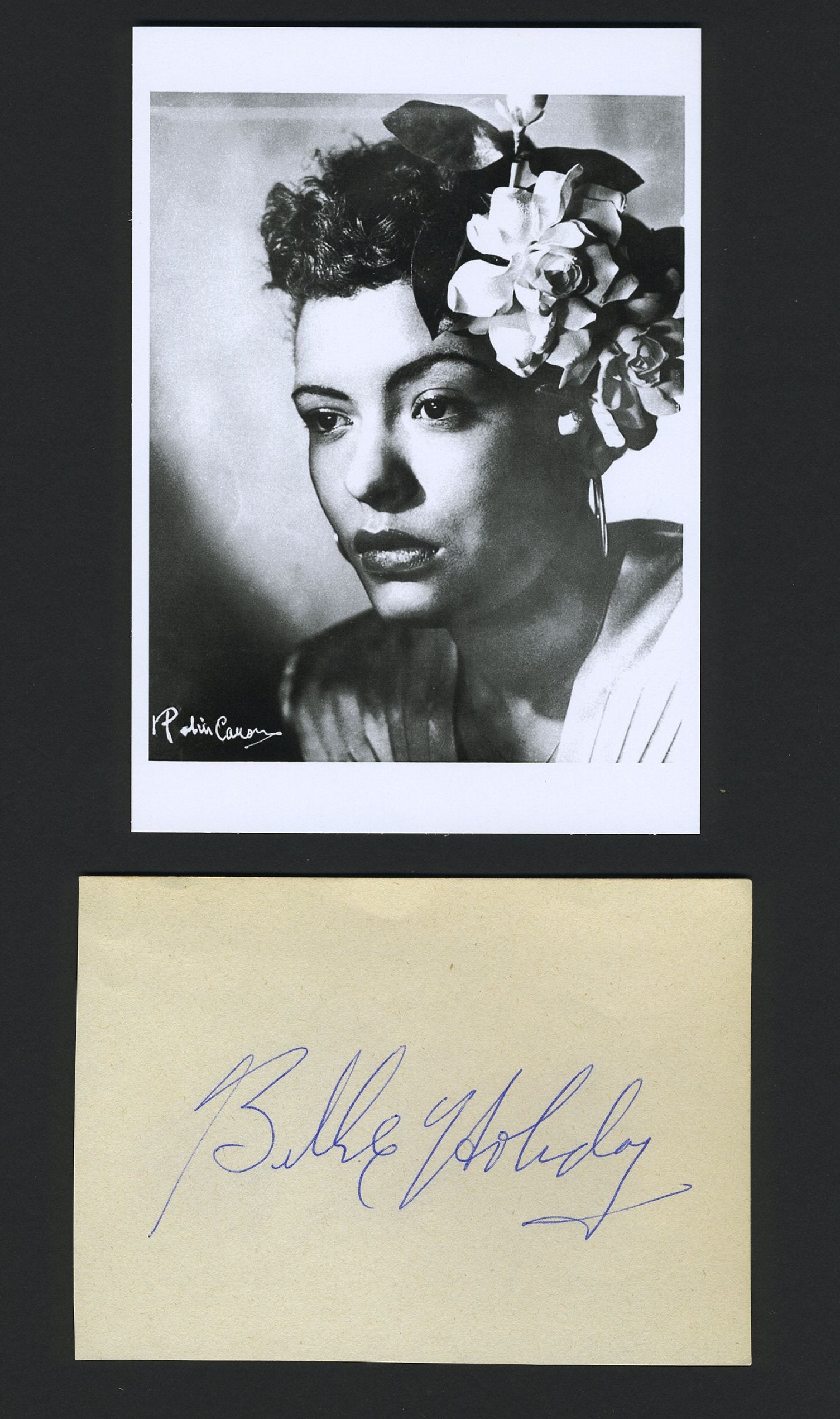 Bold blue ink signature on an off white album sheet, about 5 x 3.5. Fine condition, sold together with a recently issued postcard photograph. Revered as one of the greatest and most individual vocalists in the history of blues and jazz, she died from cirrhosis of the liver at the age of 44.