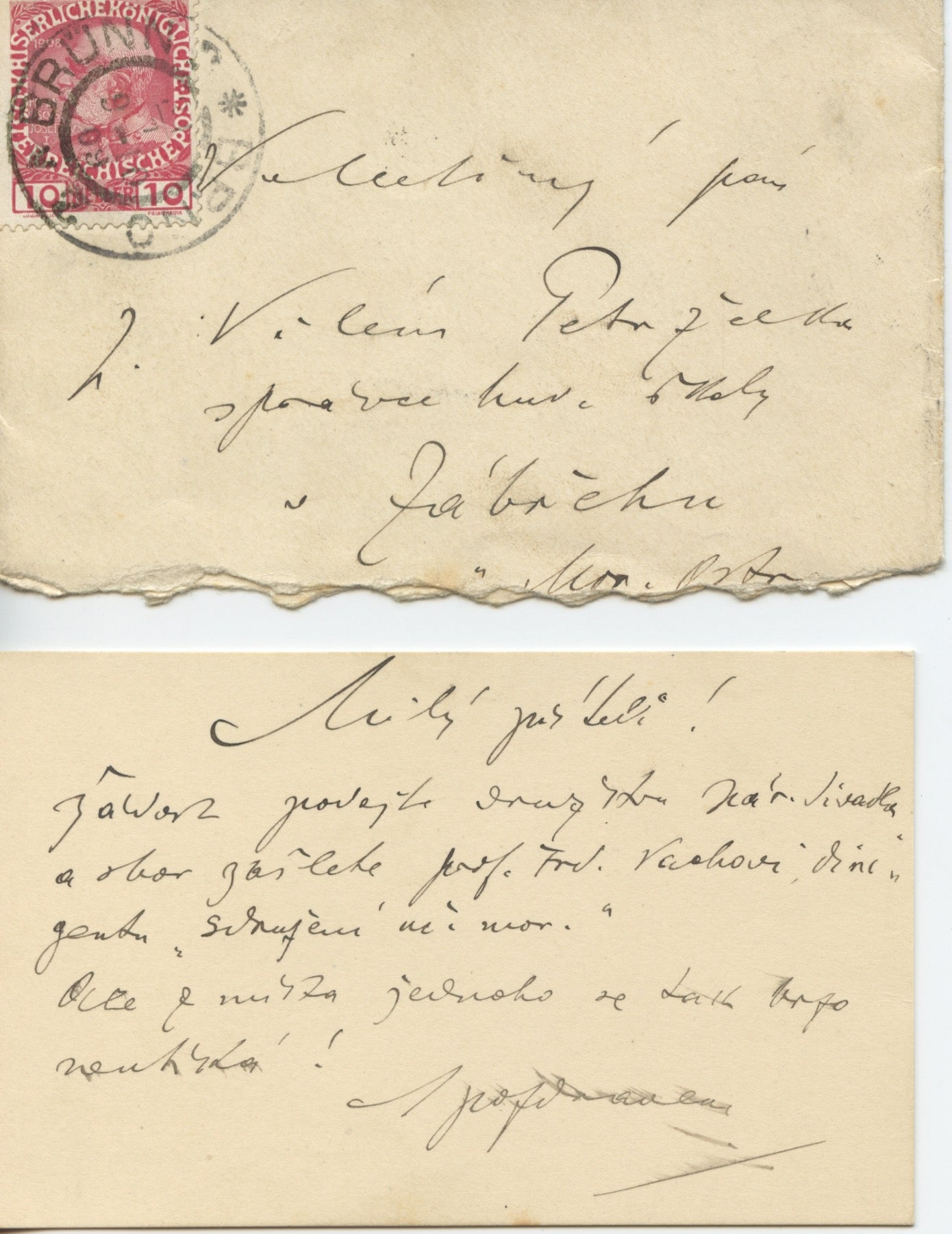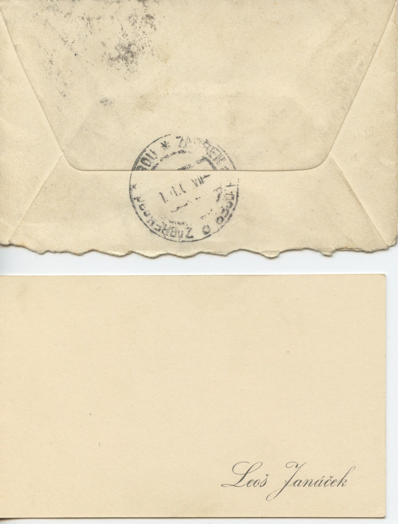 Autograph note from the Czech composer, musical theorist, folklorist, publicist, and teacher considered one of the most important opera composers of the first half of the 20th century. 6 lines in Czech on the verso of the composer's printed visiting card, untranslated, sold together with the stamped and addressed envelope. In fine condition. 4.5 x 3 inches (11.7 x 7.8 cm)