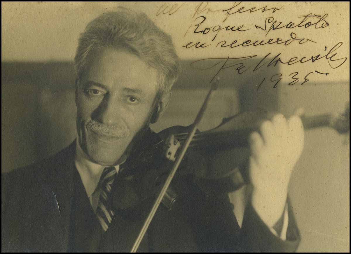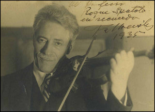 Beautiful somewhat soft-lense photograph of the beloved American violinist and composer of Austrian birth who was one of the most important musicians of the last century. A portrait of Kreisler in performance, gazing out from the image, signed and inscribed in 1935 to the Argentine clarinettist Roque Spatolo. Mounted to rigid backing, else fine. 16.5 x 23 cm.