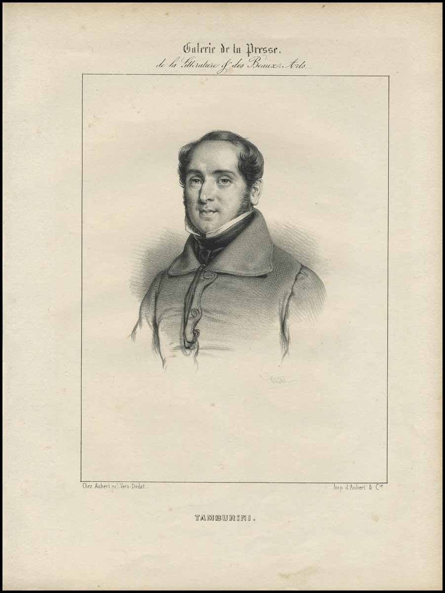 [Tamburini, Antonio. (1800 - 1876)]. Portrait Lithograph. Paris: Chez Aubert, galerie Véro-Dodat. . [ca. 1840]. Portrait lithograph of the great Italian baritone, creator of numerous Bellini and Donizetti roles. Published Chez Aubert gal. Vero-Dodat and printed by Imp d'Aubert & C., as extracted from "Galerie de la presse, de la littérature et des beaux-arts." A little toned around the edges, otherwise in fine condition. 20.5 x 27 cm (the full sheet).