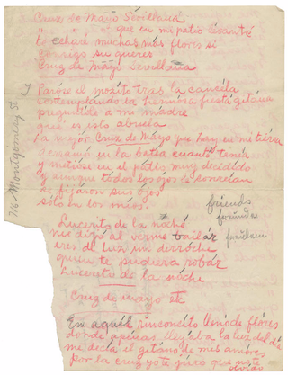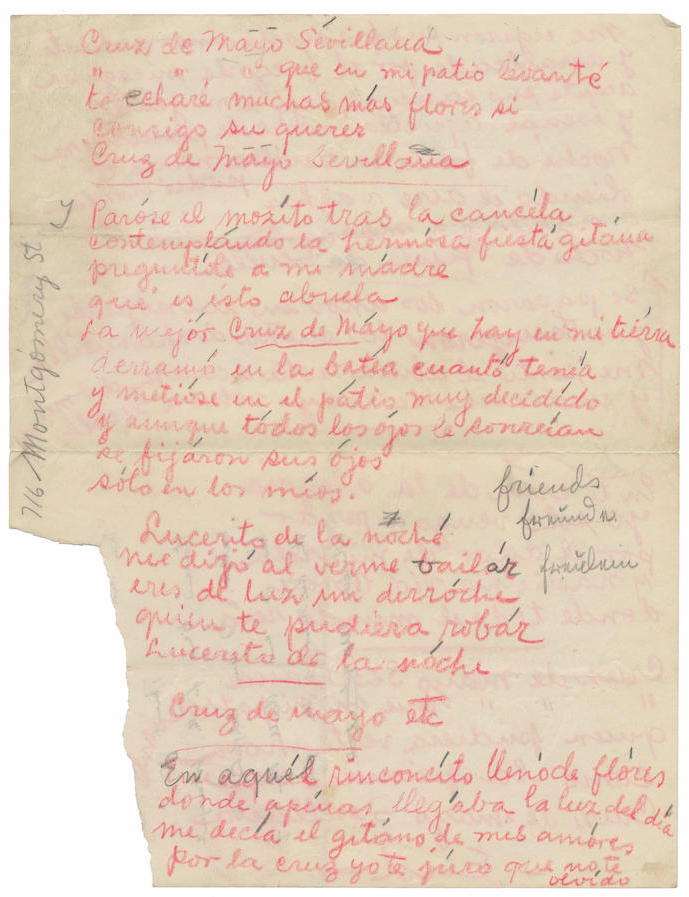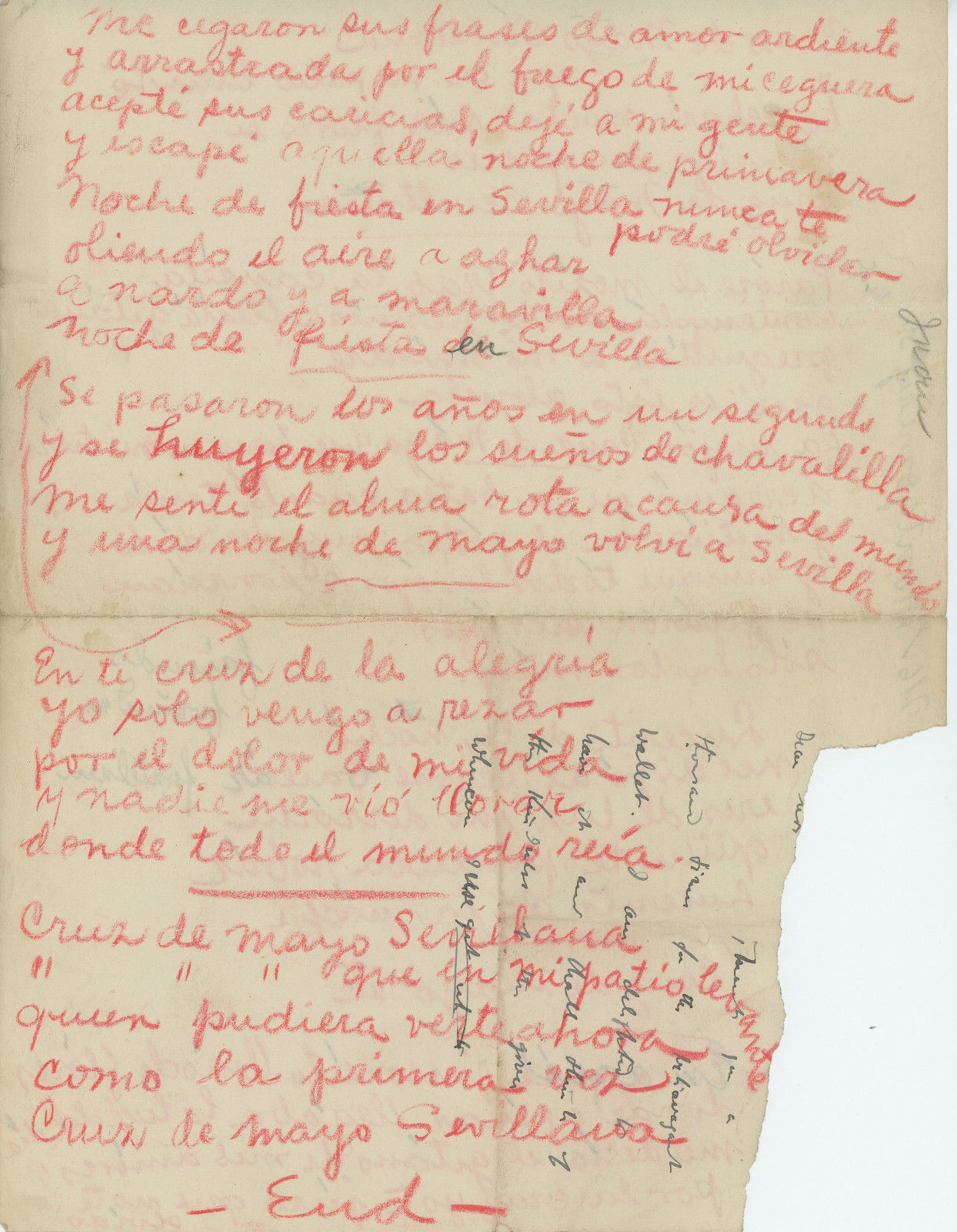 [Literature & Art] Kahlo, Frida. (1907 - 1954). Autograph Transcript of the song 'Cruz de Mayo'. Autograph transcript in red crayon of the song 'Cruz de Mayo', comprising some forty-six lines in the hand of Kahlo, beginning: "Cruz de Mayo Sevillana/ Cruz de Mayo que en mi patio laventé...", with accents entered in pencil, written on a sheet bearing part of a draft in another hand of a letter in English (possibly by Clifford Wight), both sides of a single sheet, one corner torn off before the song was written out, light dust-staining, 4to, [United States, ca. 1930].