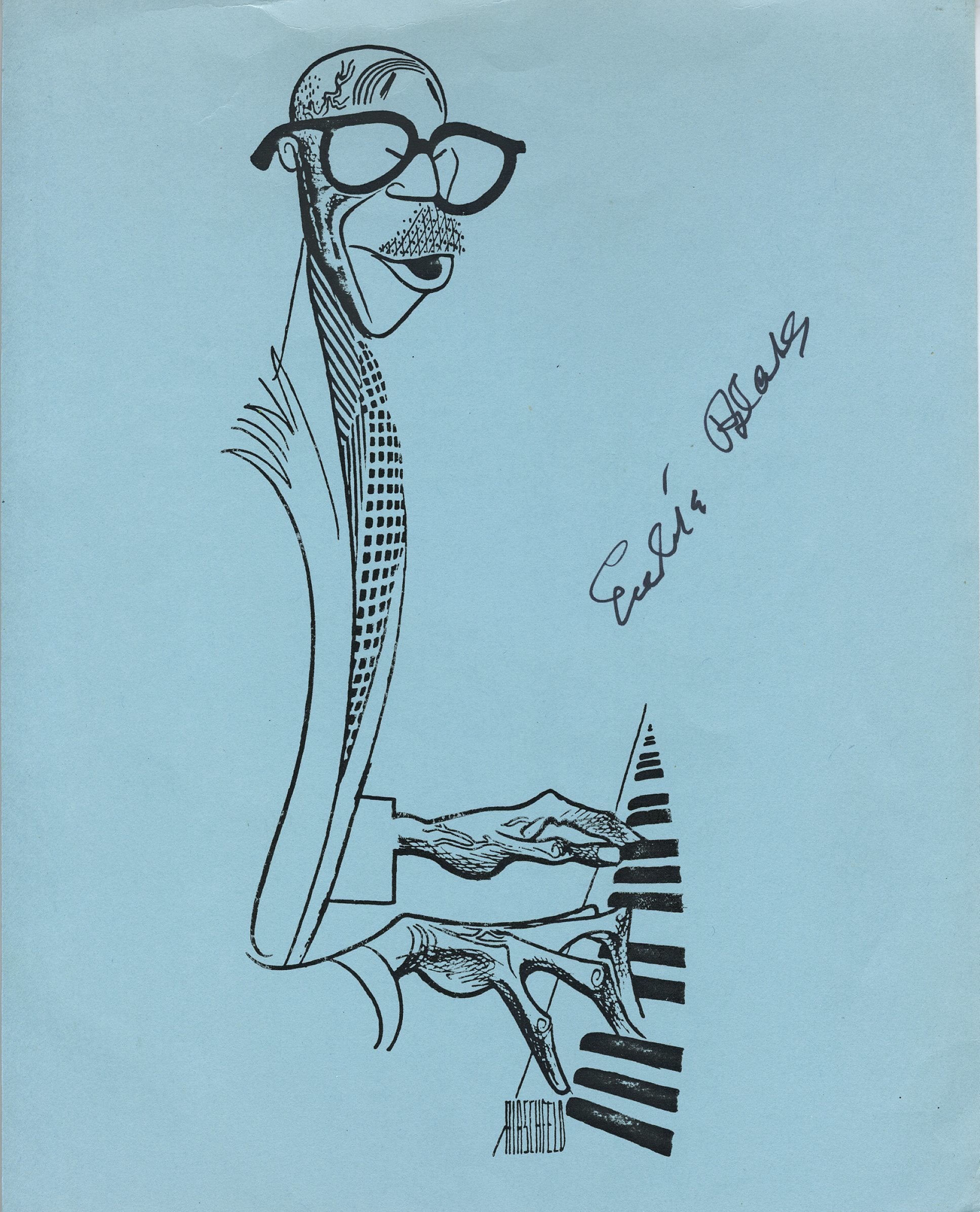 Signed printed portrait of the African-American songwriter and performer best known for the 1921 Broadway musical Shuffle Along, which included the song hit “I’m Just Wild About Harry.” Reproduction print of Hirschfeld caricature on heavy stock blue paper, signed in bold black ink by Blake "Eubie Blake." Fine. 8 x 10 inch (20 x 25 cm).