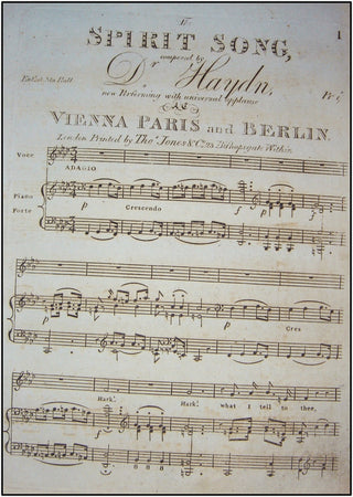 HobXXVIa/41. Engraved, no PN. 4 pp. A very fine early copy of this beautiful song, composed by Haydn during one of his visits to London towards the end of his life. Like most of his English songs - including the somewhat earlier "Canzonettas" - it is written to words by his friend, Anne Hunter. This little work is a "masterpiece of imagination. Even its key, F minor, is significant, and like all Haydn's English songs, it opens with a long passage for the piano in which (as throughout the four verses) the accompaniment paints the scene and carries on the action with an initiative worthy of Schubert...The song is usually supposed to belong to Haydn's second English sojourn and is even referred to as being one of the Canzonets. From the nature of the music itself, I should be disposed to place its composition three or four years later, during the period when Haydn was at work on his finest quartet - those of Op. 76 and Op. 77." (Marion Scott, "Some English Affinities and Associations of Haydn's Songs." Music and Letters, Vol XXV No. 1)