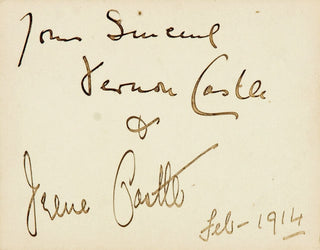 Castle, Vernon. (1887 - 1918) & Castle, Irene. (1893-1969). Autograph Signatures on Calling Card. An exceedingly rare example of the signatures of the popular ballroom dancers credited with invigorating the popularity of modern dancing. Dated February, 1914. Inscribed by famous dance team Vernon and Irene Castle. Ink on card measuring approximately 2.5 x 3.5 inches. Light toning and edgewear. Very good.