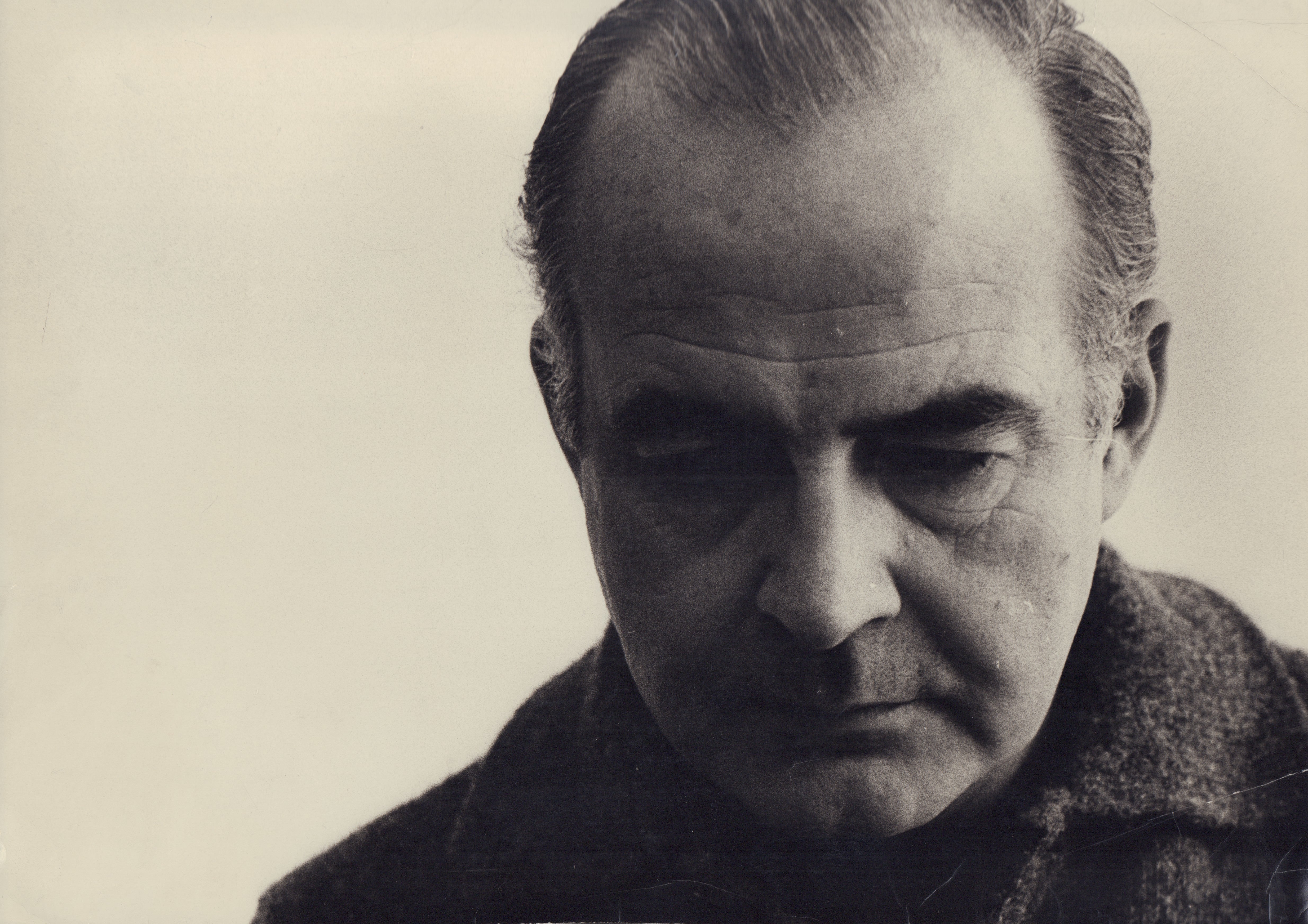 Barber, Samuel. (1910–1981). Large Original Photograph. Beautiful large original photograph of the important American composer ca. 1960's, shown looking downwards against a blank background. Some creases; overall in very good condition. The photographer is unidentified. 16.5 x 12 inches (42 x 30.3 cm).