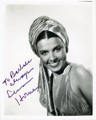 An attractive glossy photograph of the great American jazz and pop singer in a shiny outfit and turban, boldly signed and inscribed at the left. A later reprint of a ca. 1940's image, with original signature, in very fine condition. 8 x 10 inches (20.4 x 25.4 cm).