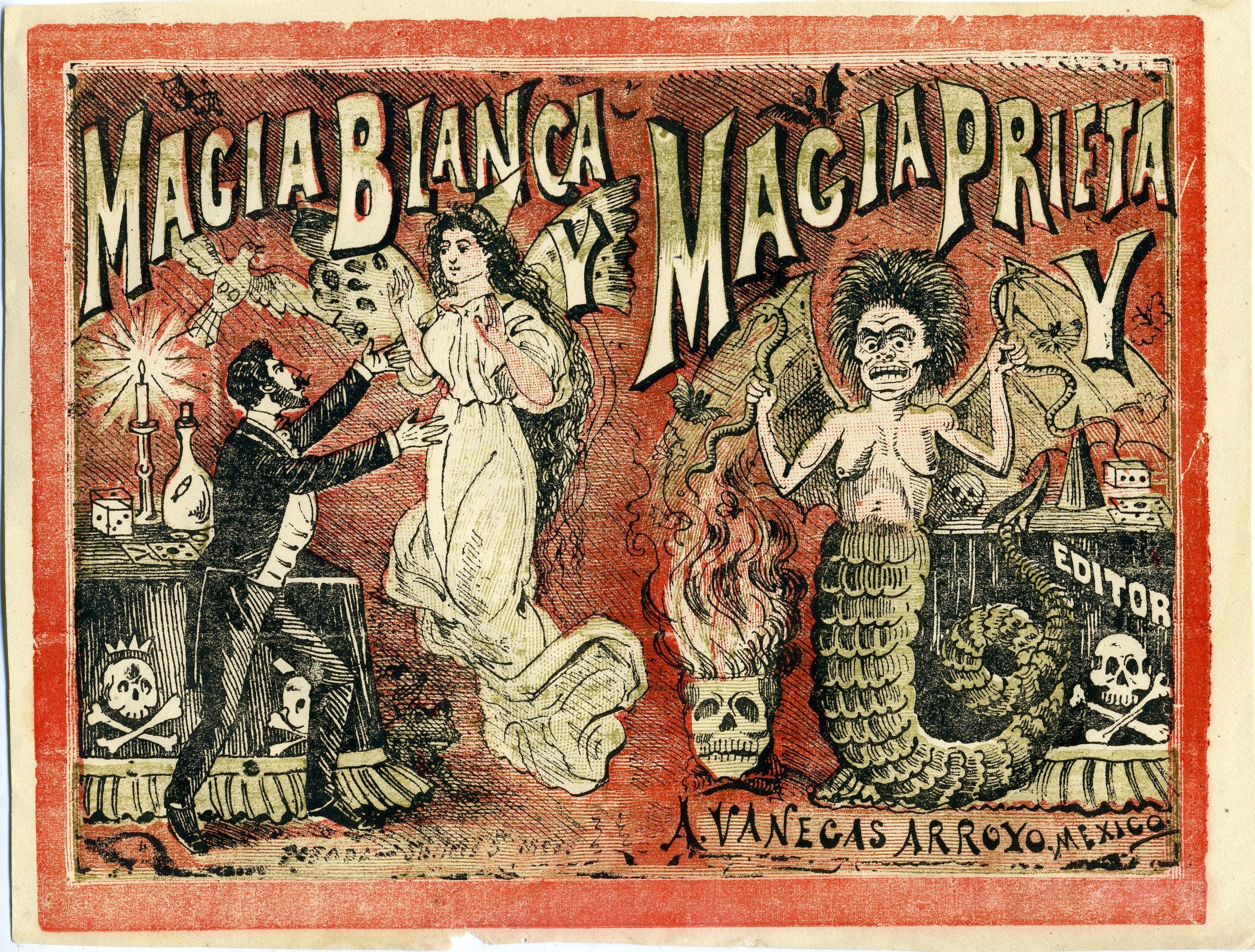Striking color woodcut proof for the cover of a magic book, by the great engraver known as the "Printmaker to the Mexican People." Titled "Magia blanca y magia prieta" (White magic and dark magic), the image shows a magician, an angel, a fearsome devil and many more symbols of sorcery. The name of the printer, Antonio Vanegas Arroyo, who published many of Posada's works, appears at the lower right. Printed in black, red, and brown inks. Overall toning, light ink smudging on parts of the print, slightly irregularly trimmed, with light wear and one chip to the lower edge; otherwise in fine condition for a proof. 8.75 x 6.75 inches (22.1 x 17 cm).