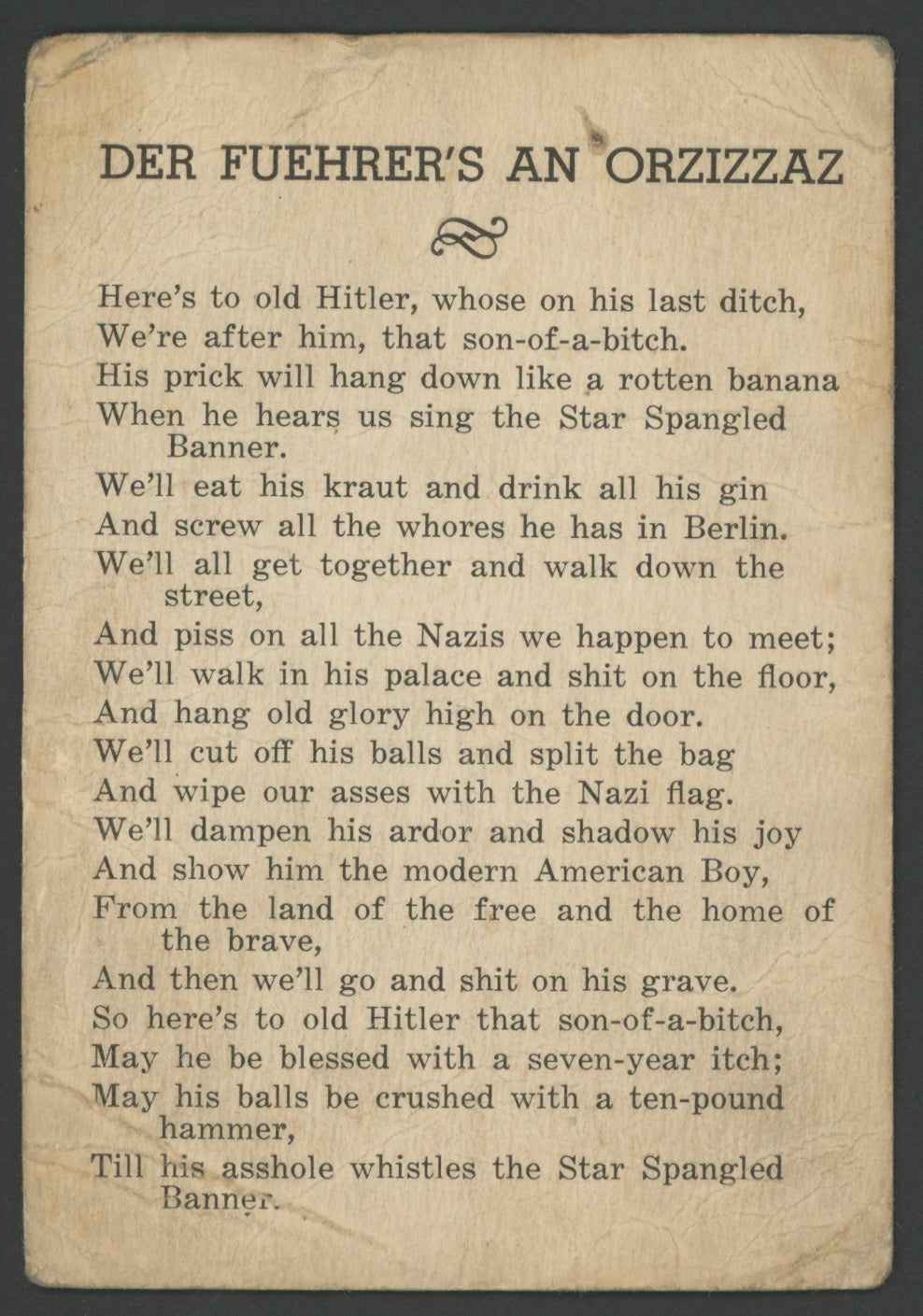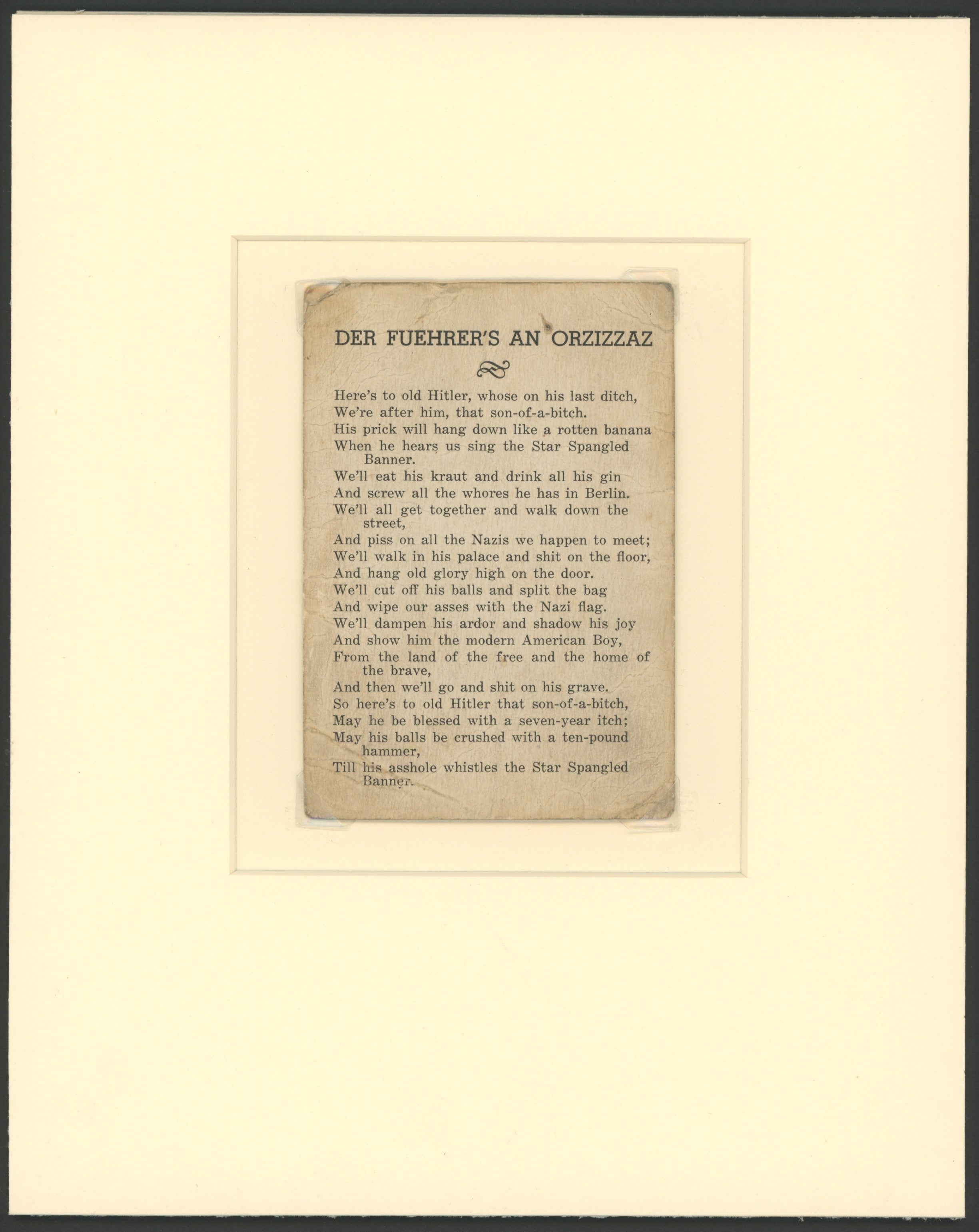 Amusing and obscene original WWII poem beginning, "Here's to old Hitler, whose on his last ditch, / We're after him, that son-of-a-bitch," printed on a small card ca. 1944, presumably to be distributed among American soldiers. Mounted with plastic corners and very nicely matted for framing. Slight toning, soiling, and general age wear; overall in very good condition. 3 x 4.5 inches (7.8 x 11.3 cm); mounted to 8 x 10 inches.