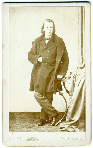 CDV photograph of the young Brahms, standing, leaning on his left hand on a table with his right hand inside his coat. With the photographer's name, Löwy (Vienna), at the foot. Mounted on card with several handwritten notes and references in pencil (in German) on the verso. 2.5 x 4 inches (6.5 x 10.4 cm). Fine.