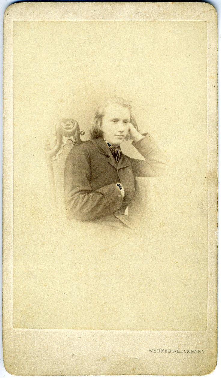 CDV vignette portrait of the young Brahms, leaning on his left elbow with his right hand inside his coat. With the photographer's name, Wehnert-Beckmann of Leipzig, at the foot and on the verso. Dated in pencil on the verso: 1853. 2.5 x 4 inches (6.1 x 10.5 cm). Fine.