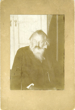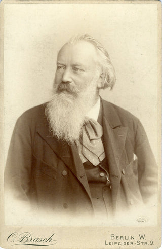 Cabinet portrait photograph of Brahms, half-length, seated, looking to the left. On the photographer's mount: C. Brasch, Berlin, Leipziger-Str 9. Stamped with the date [of printing] at the lower right: 1897. 4.25 x 6.5 inches (10.9 x 16.6 cm). Very fine.