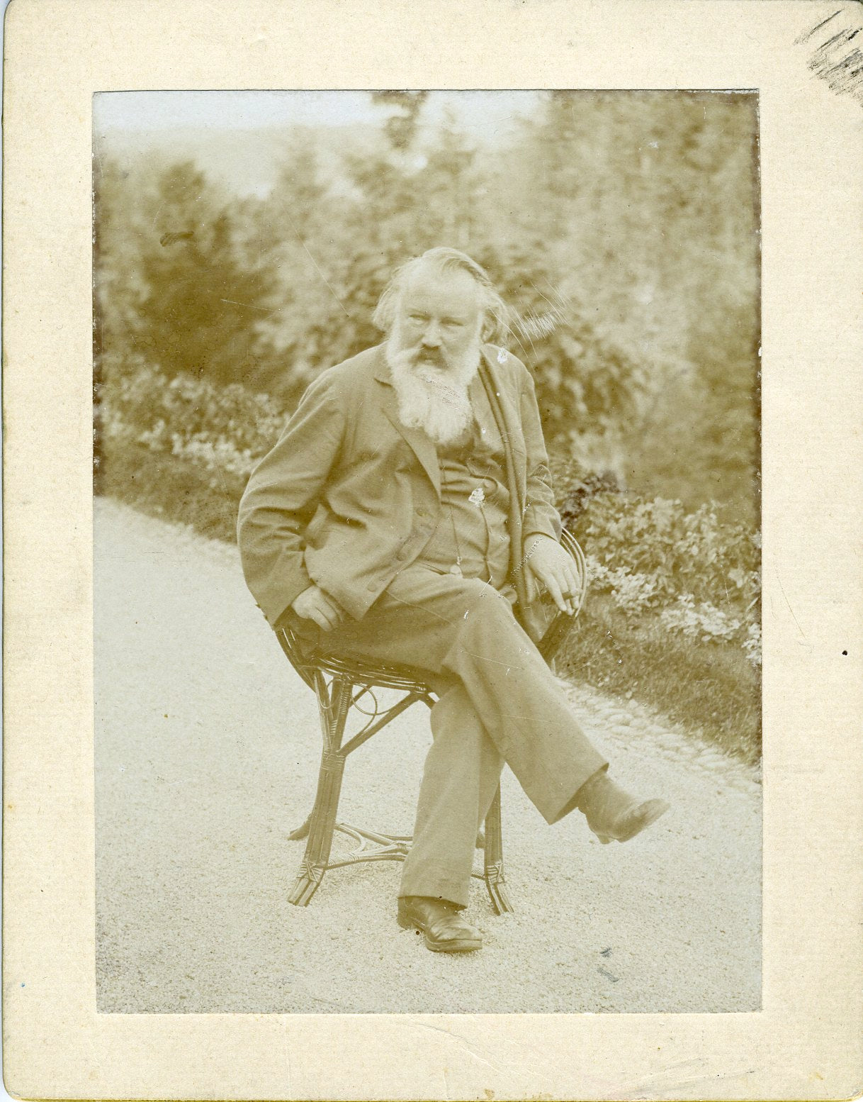Photograph of Brahms, seated with his legs crossed on a wicker chair, outside in a garden. On the photographer's mount: Eugen v. Miller, jr, Wien und Gmunden. Undated. 4 x 5.25 inches (10.5 x 13.2 cm). Fine.
