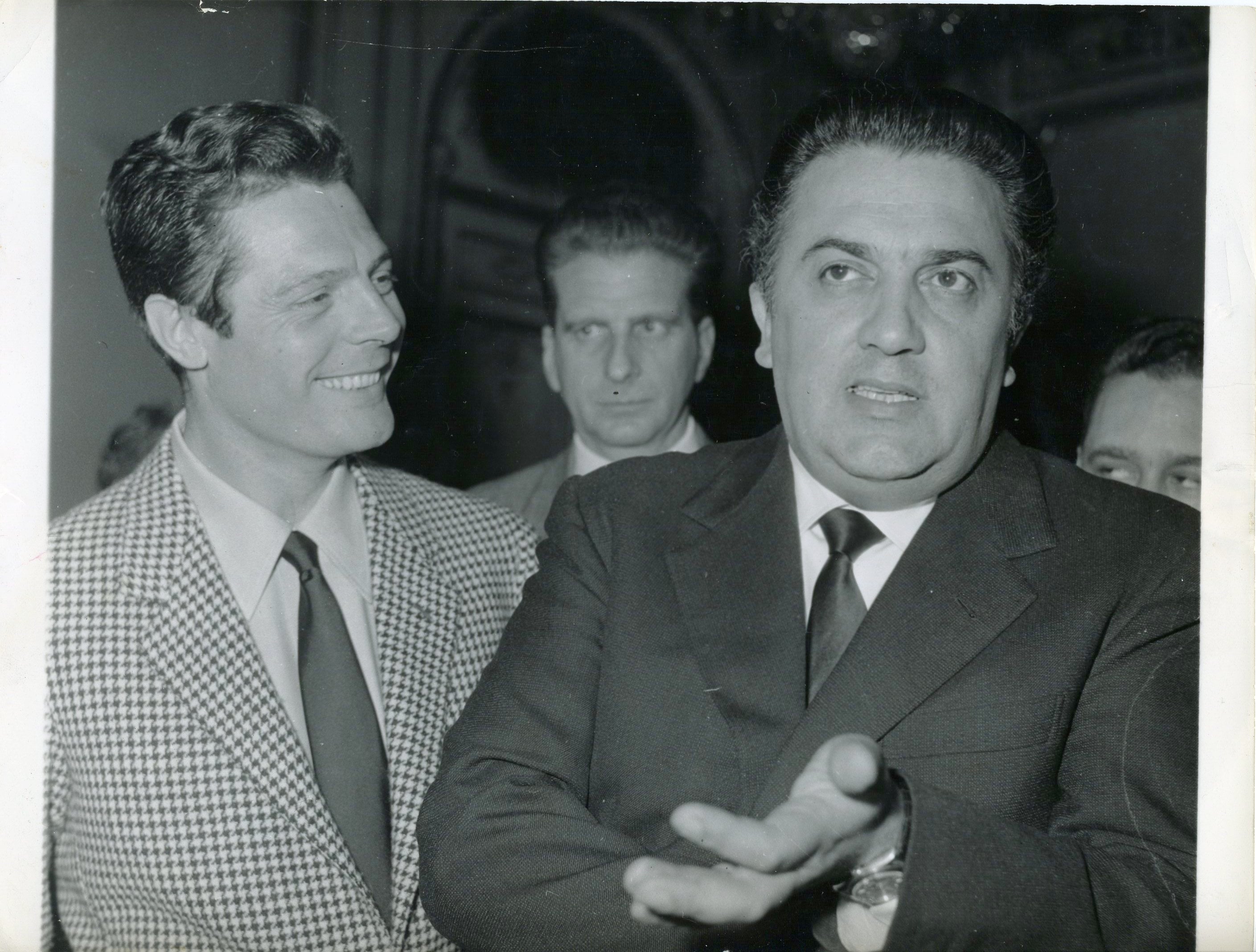 Fellini, Federico. (1920–1993) & Mastroianni, Marcello. (1924–1996). Original Press Photograph. Original 1960 press photograph of the important director and screenwriter, appearing in Paris to present La Dolce Vita, "which was judged scandalous in Rome," with the film's leading man, Marcello Mastroianni. Original press caption in French on the verso. One crease and a little surface loss along the upper edge; overall in fine condition. 9.5 x 7 inches (24 x 18.2 cm).