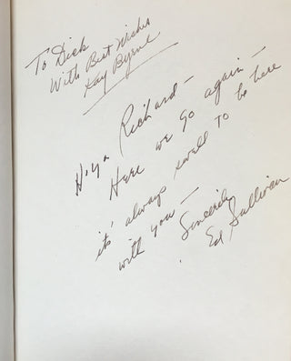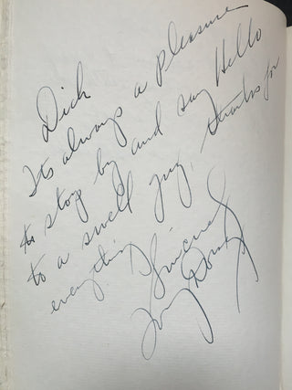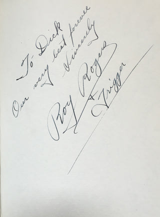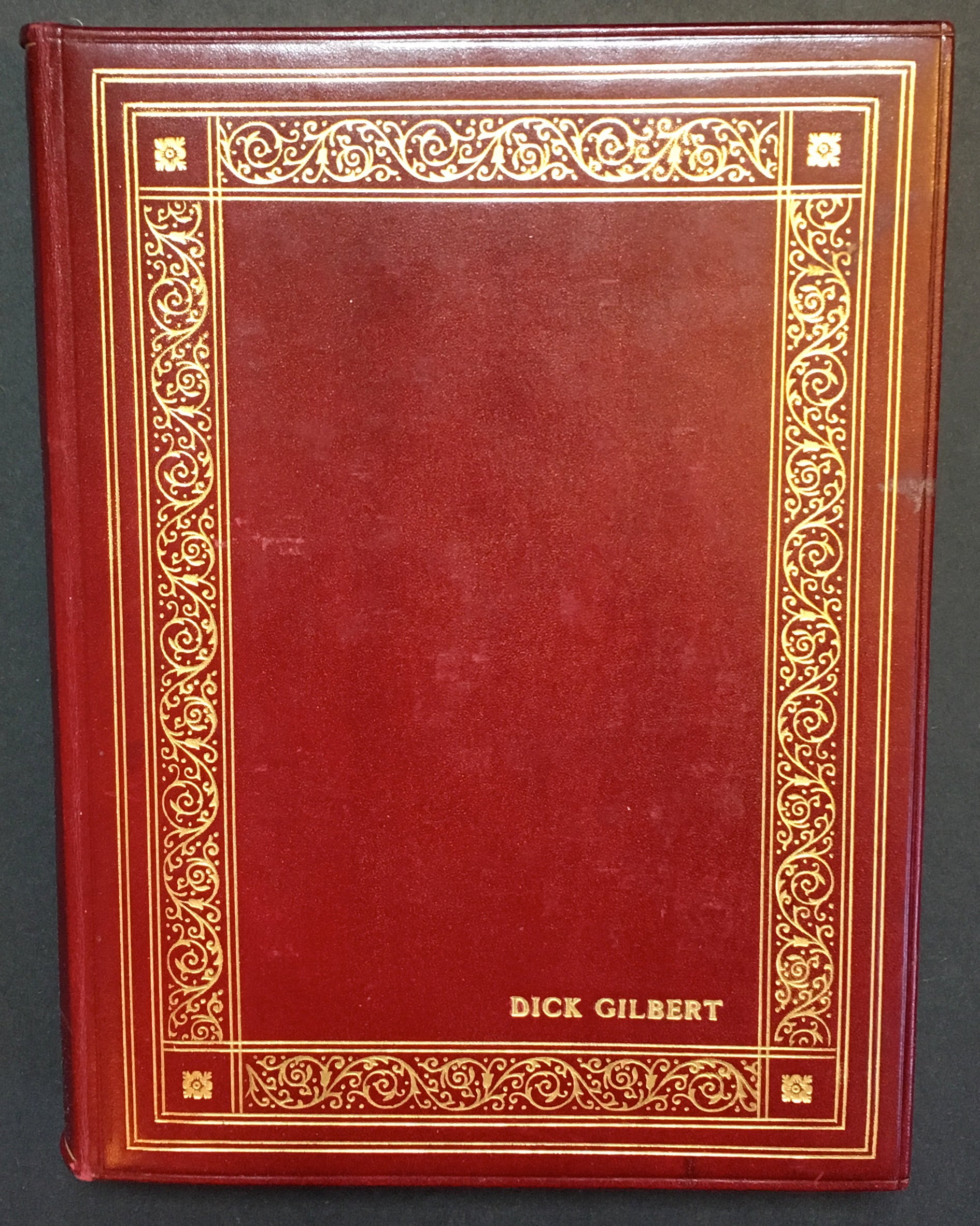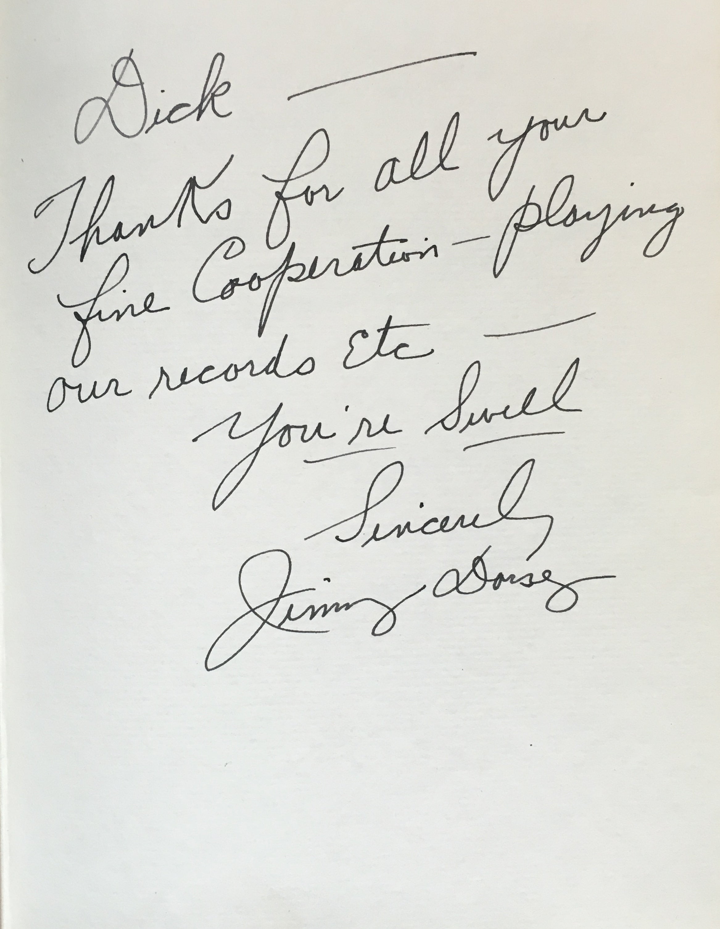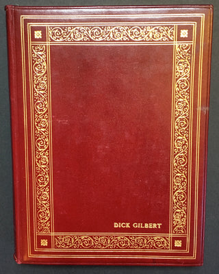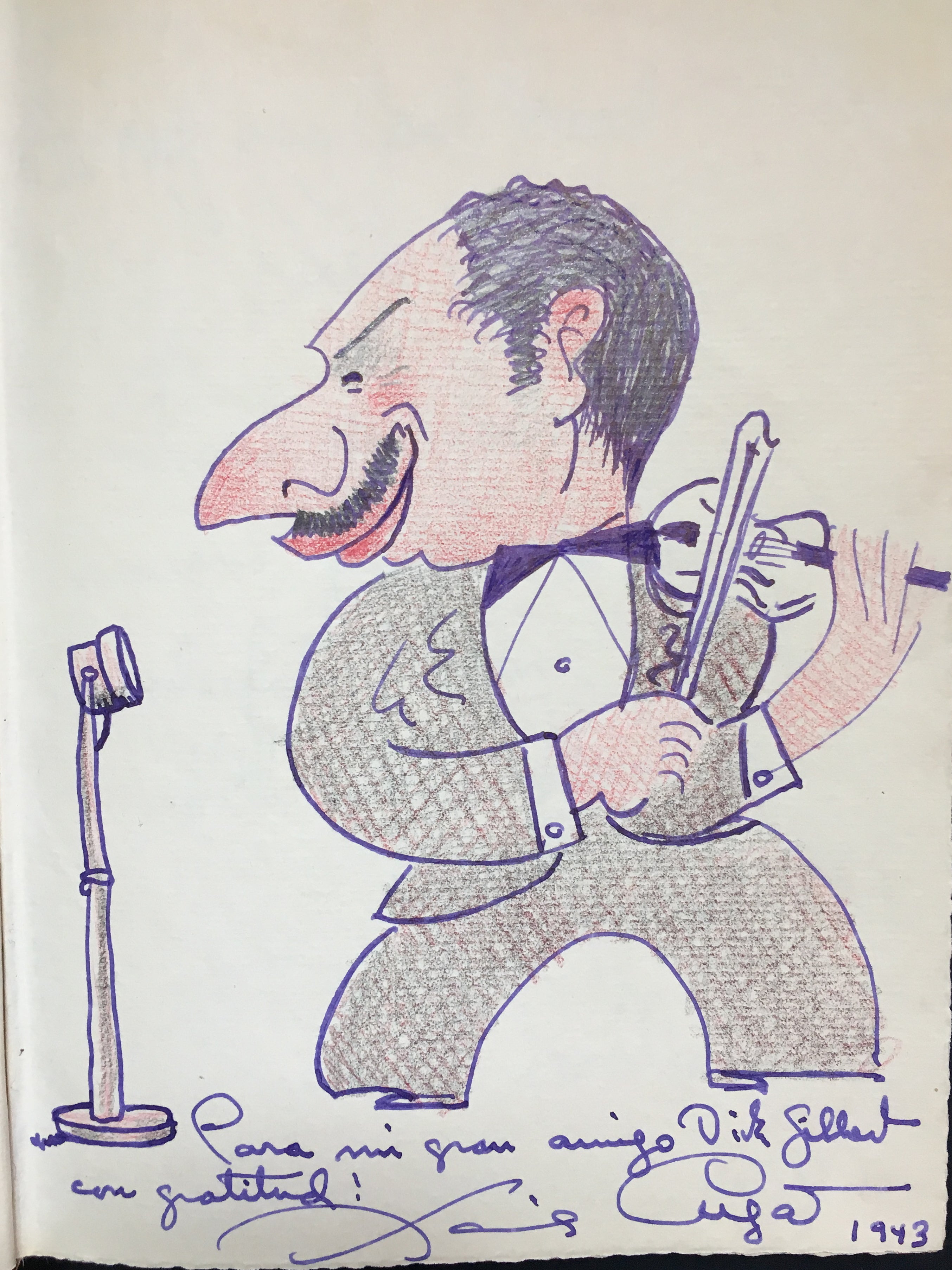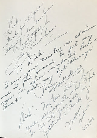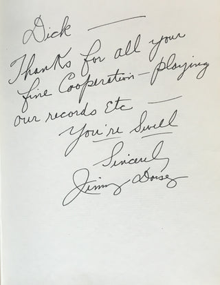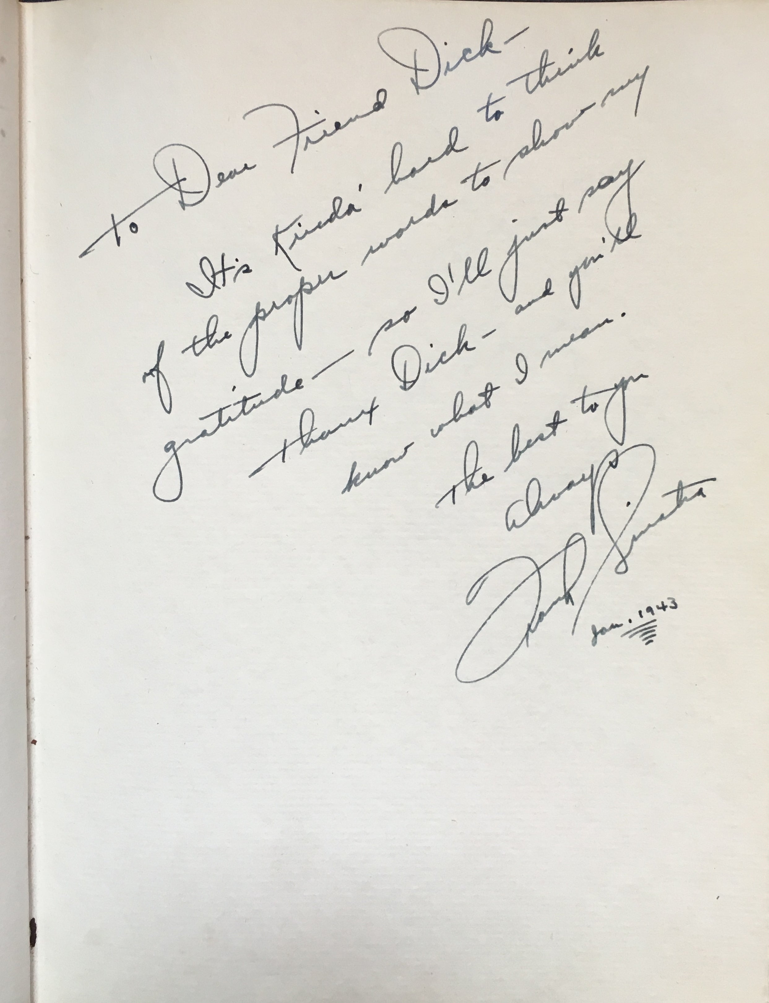 An interesting and attractive album of warm personal inscriptions and autograph signatures assembled in the 1940s by Dick Gilbert, a DJ on Arizona radio station KTYL who hosted on his show a veritable who's-who of popular music of the era. The leather album, embossed with Gilbert's name, contains signatures and personal inscriptions from jazz musicians, bandleaders, singers, actors, and Latin stars including Frank Sinatra, Duke Ellington, Cab Calloway, Gene Krupa, the Andrews Sisters, Ed Sullivan, Tito Guizar, Cab Calloway, Jimmy and Tommy Dorsey, Roy Rogers (and Trigger!) and many more. Most of the stars have written notes of thanks to Gilbert, some even adding sketches (the first page of the album has an amusing self-portrait caricature by Xavier Cugat). Frank Sinatra writes "It's kinda hard to think of the proper words to show my gratitude - so I'll just say thanx Dick - and you'll know what I mean," dated January 1943, and Krupa inscribes "To Dick - Thankz Ten Million For All The Fine Plugs." Included with the album in its original box are four brightly colored posters from Gilbert's show, each advertising a new record of the late 1940's and featuring a great caricature of Gilbert with a pile of records. Also included is a further unidentified signature on a brochure from an Arizona golf course.