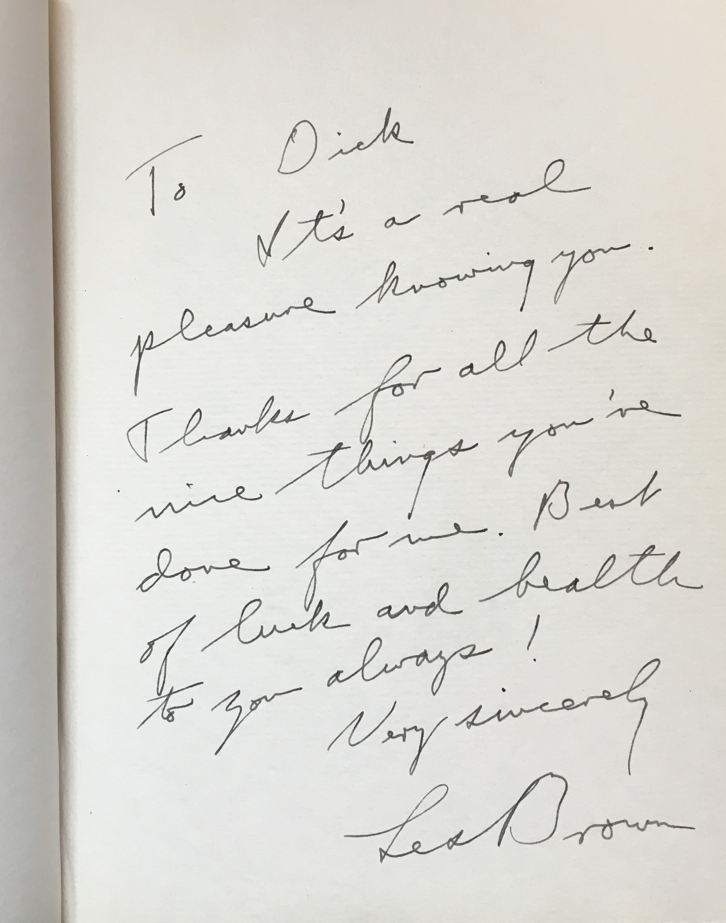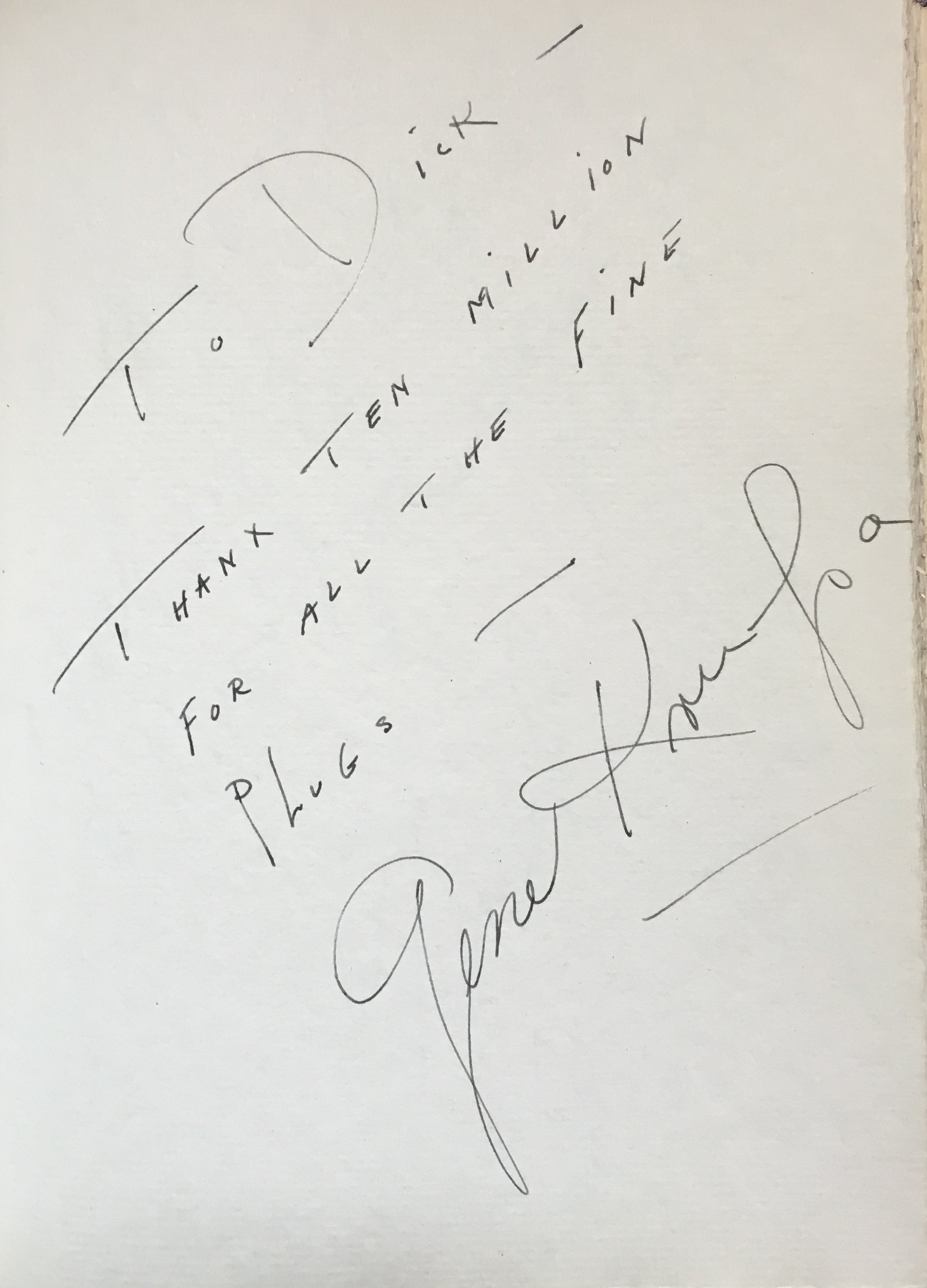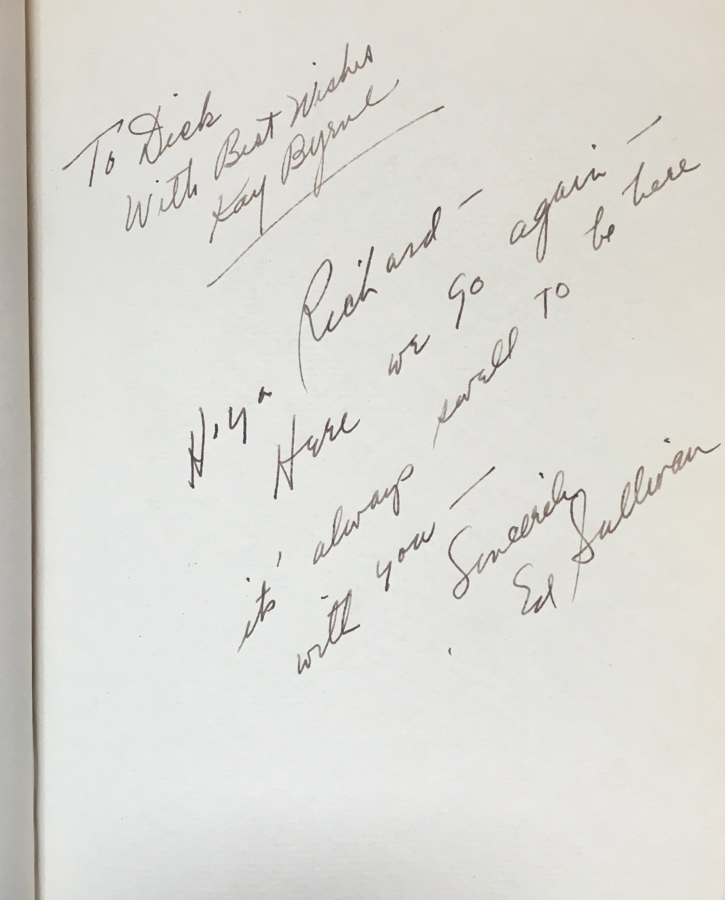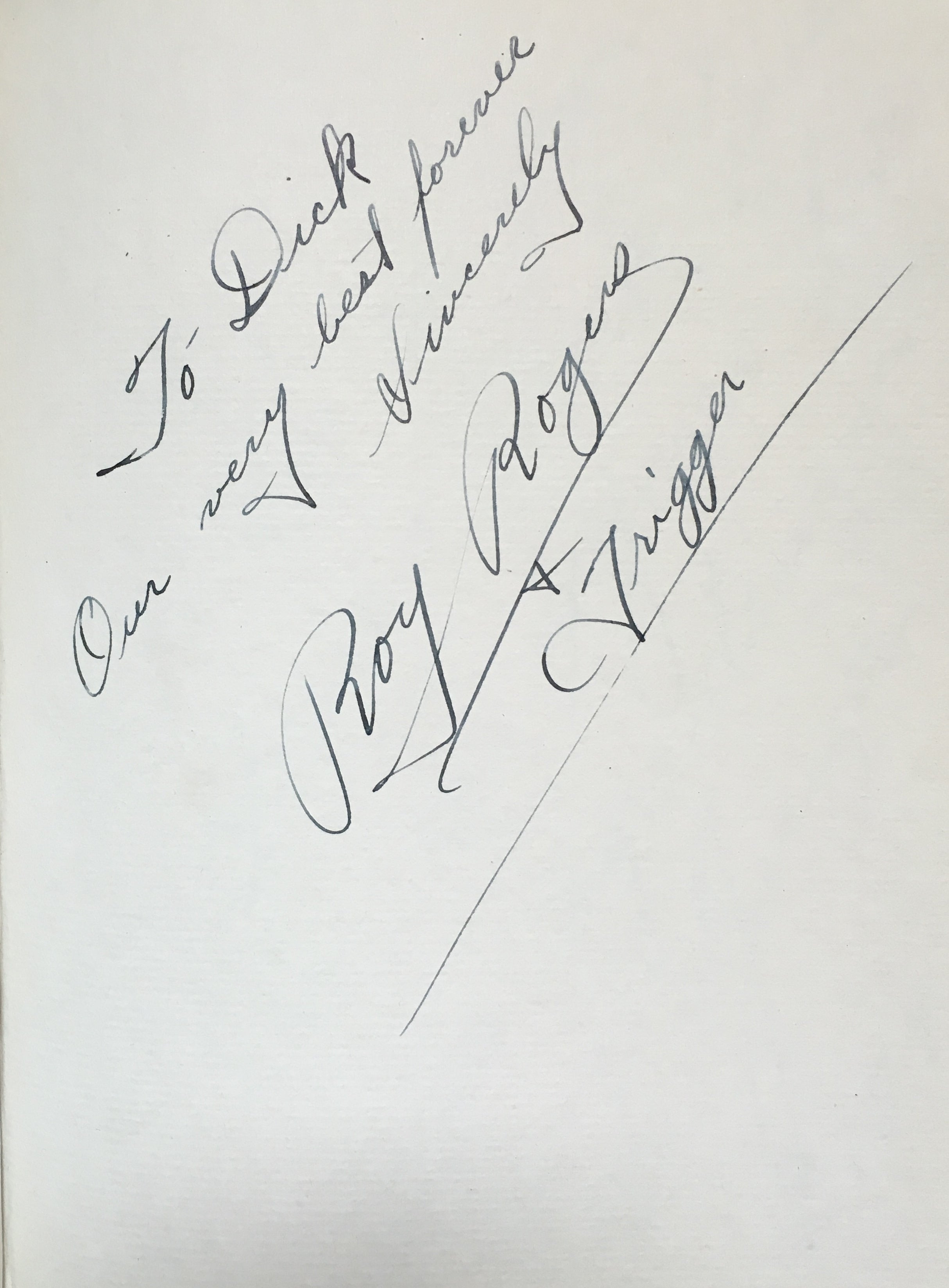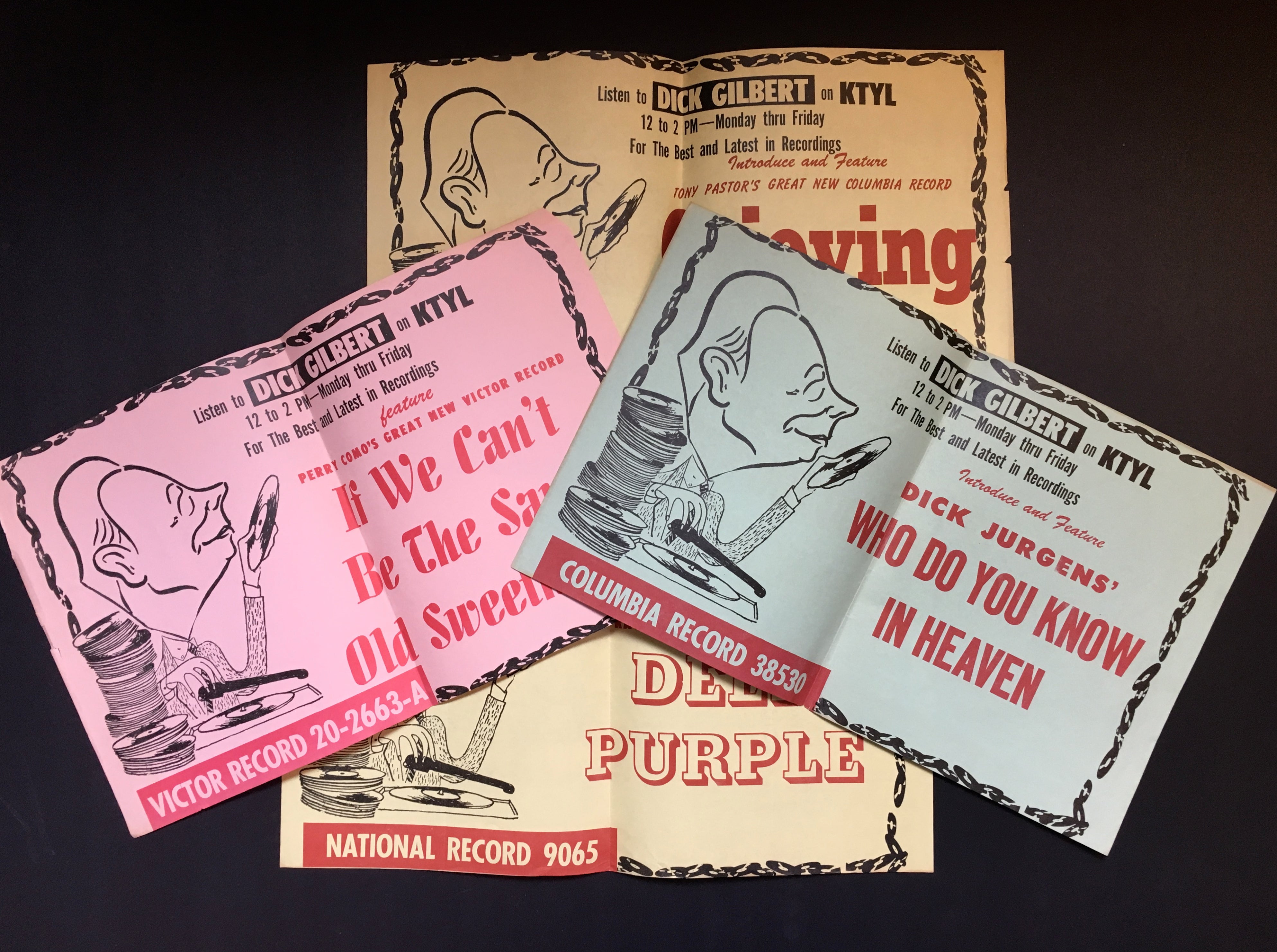 An interesting and attractive album of warm personal inscriptions and autograph signatures assembled in the 1940s by Dick Gilbert, a DJ on Arizona radio station KTYL who hosted on his show a veritable who's-who of popular music of the era. The leather album, embossed with Gilbert's name, contains signatures and personal inscriptions from jazz musicians, bandleaders, singers, actors, and Latin stars including Frank Sinatra, Duke Ellington, Cab Calloway, Gene Krupa, the Andrews Sisters, Ed Sullivan, Tito Guizar, Cab Calloway, Jimmy and Tommy Dorsey, Roy Rogers (and Trigger!) and many more. Most of the stars have written notes of thanks to Gilbert, some even adding sketches (the first page of the album has an amusing self-portrait caricature by Xavier Cugat). Frank Sinatra writes "It's kinda hard to think of the proper words to show my gratitude - so I'll just say thanx Dick - and you'll know what I mean," dated January 1943, and Krupa inscribes "To Dick - Thankz Ten Million For All The Fine Plugs." Included with the album in its original box are four brightly colored posters from Gilbert's show, each advertising a new record of the late 1940's and featuring a great caricature of Gilbert with a pile of records. Also included is a further unidentified signature on a brochure from an Arizona golf course.