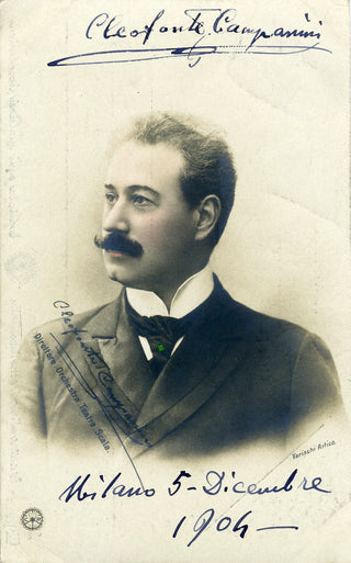 Campanini, Cleofonte. (1860–1919). Signed Hand-Colored Postcard. A signed hand-colored portrait postcard of the important Italian conductor, brother of the tenor Italo Campanini and conductor at La Scala for three years. Campanini has signed boldly above his image and dated the postcard Milan, December 5, 1904--the year in which he conducted the premiere of Madama Butterfly. His cheeks, lips, and tie pin have been carefully hand-colored. On the verso, the postcard is addressed to the Argentinian collector Ramona Imaz Otaño, with the original Italian stamp and postmark. A few slight smudges; overall in fine condition. 3.5 x 5.5 inches (8.6 x 13.8 cm).