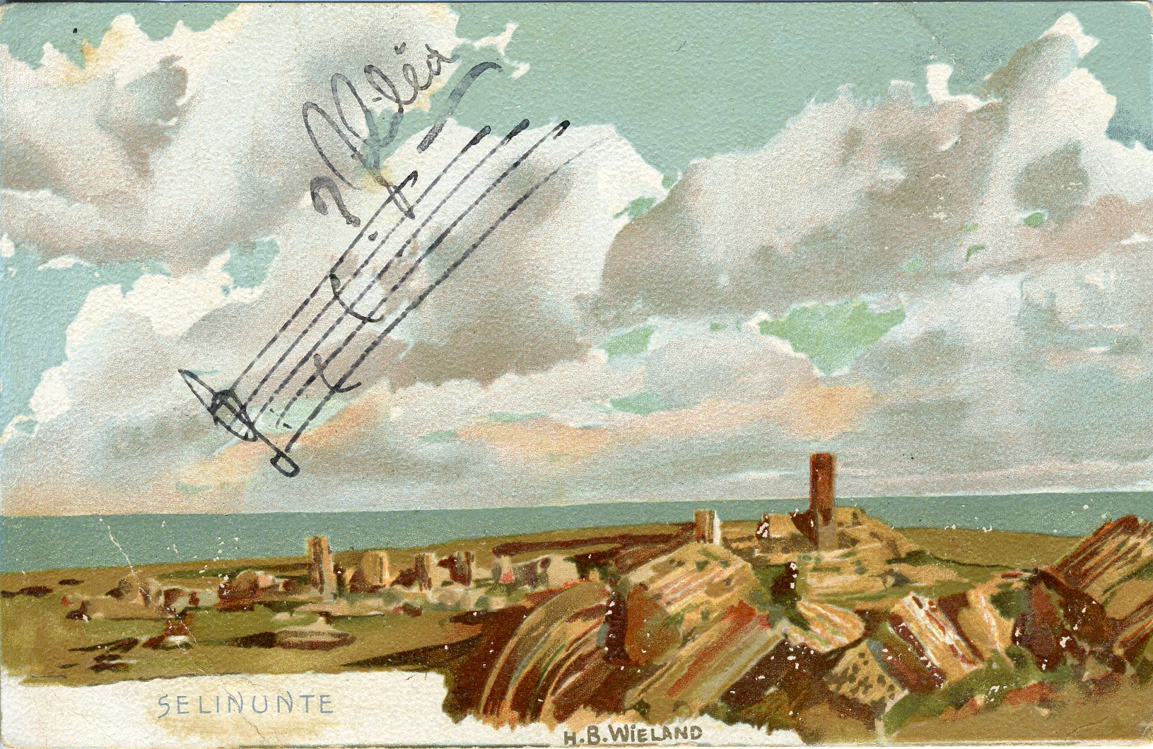 Cilea, Francesco. (1866-1950). Autograph Musical Quotation. An enigmatic and picturesque AMQS from the Italian composer known for his operas L'arlesiana and Adriana Lecouvreur. On a postcard showing a painting Selinunte (Sicily) by Swiss painter Hans Beat Wieland, Cilea has penned a brief snippet of two notes and a question mark, signed above the staff in the painted clouds. On the verso, the postcard is addressed to the Argentinian collector Ramona Imaz Otaño. Undated, ca. 1900-1910. Very slightly smudged; overall in fine condition. 5.5 x 3.5 inches (13.9 x 8.9 cm).