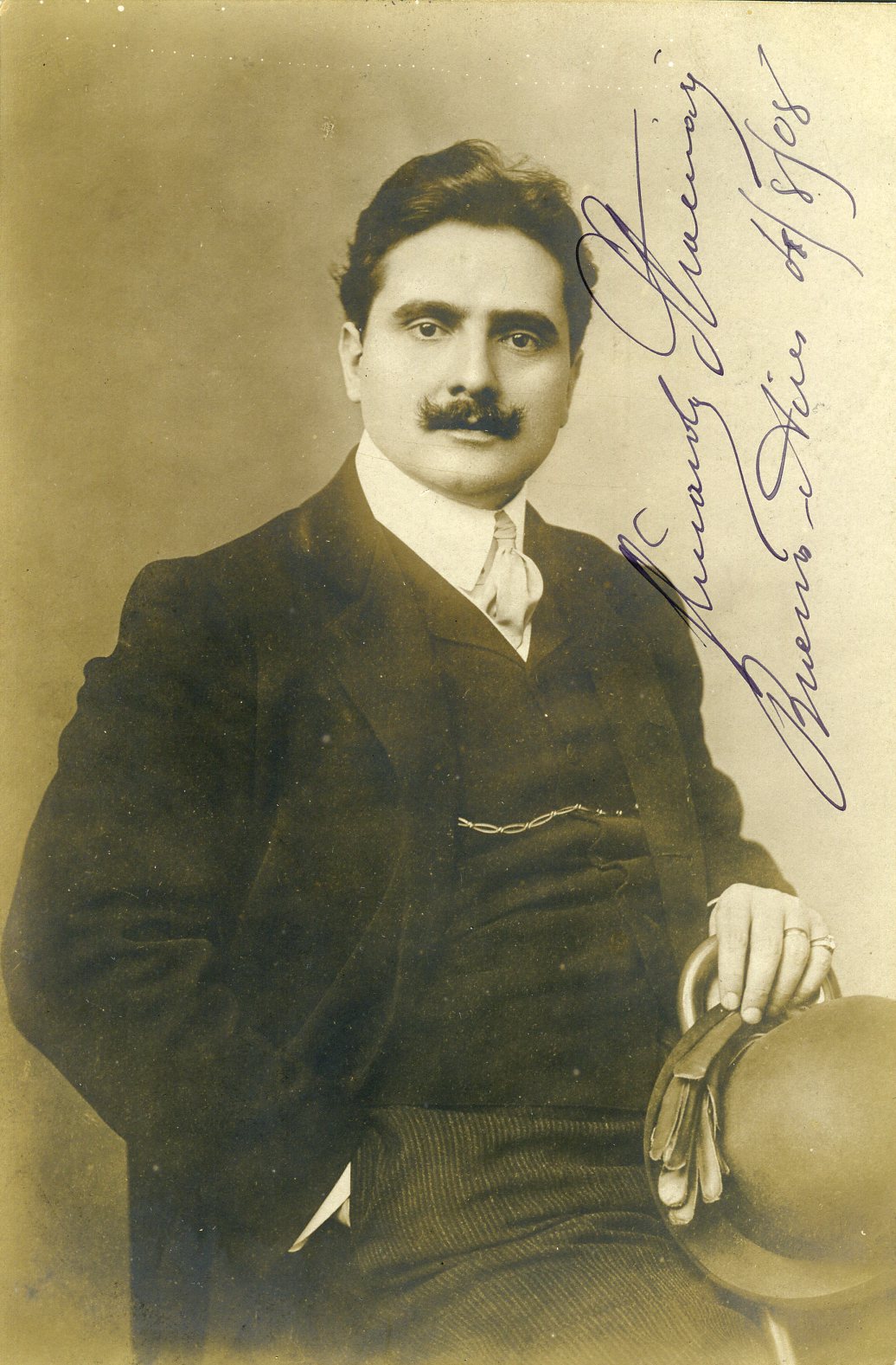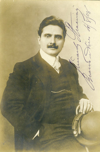 Stracciari, Riccardo. (1875-1955). Signed Photograph Postcard. An excellent signed photograph postcard of the great Italian baritone, shown in a formal pose holding his hat and gloves. Stracciari has signed at the right and dated Bueons Aires, August 4, 1908. On the verso, the postcard is addressed to the Argentinian collector Ramona Imaz Otaño. With the stamp partially removed, otherwise in very fine condition. 3.5 x 5.5 inches (8.9 x 13.4 cm).