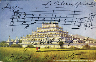 Dupont, Gabriel. (1878-1914). "La Cabréra" - Rare AMQS on a Postcard. An uncomoon autograph musical quotation from the French composer known for his operas and chamber music. On a postcard showing a pagoda in Mandalay, Burma, Dupont has penned three measures from the prelude to his opera La Cabréra, which won him the Sonzogno Prize in Italy in 1905. He has signed boldly across the image and dated Paris, October 1905. On the verso, the postcard is addressed to the Argentinian collector Ramona Imaz Otaño, with original French stamp and postmark. Slight wear to the edges; overall in fine condition. 5.5 x 3.5 inches (13.7 x 8.8 cm).