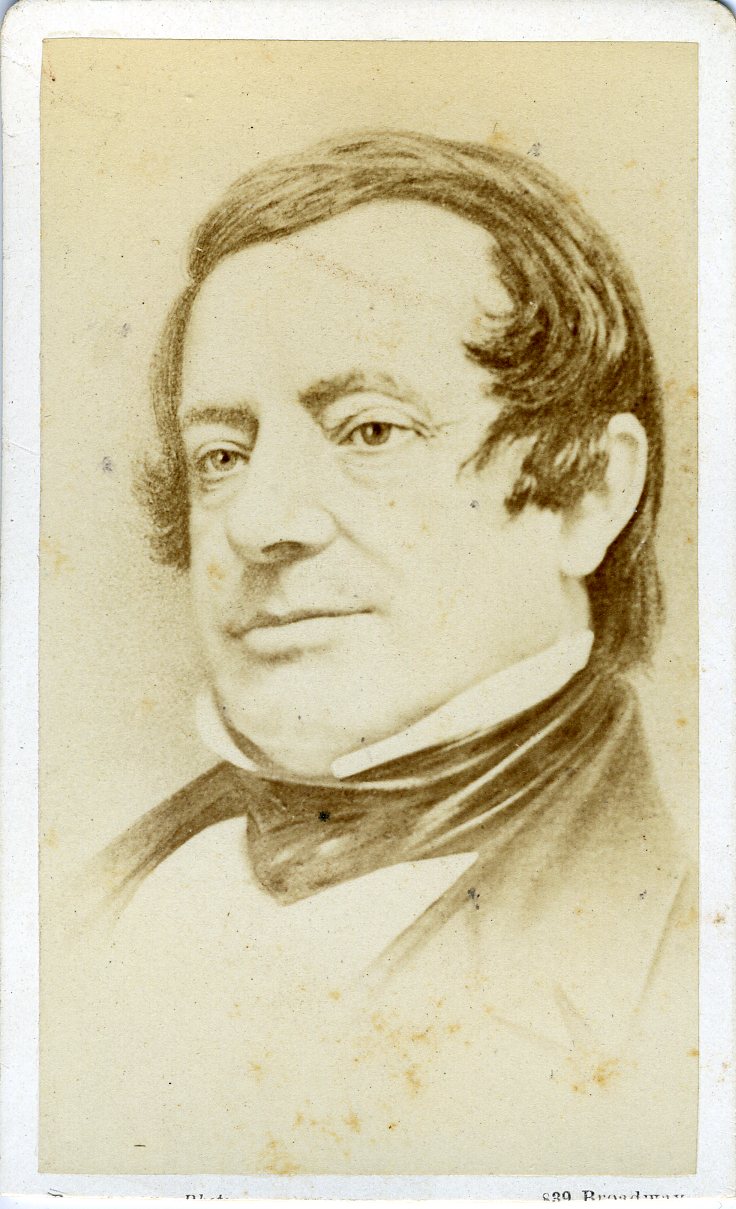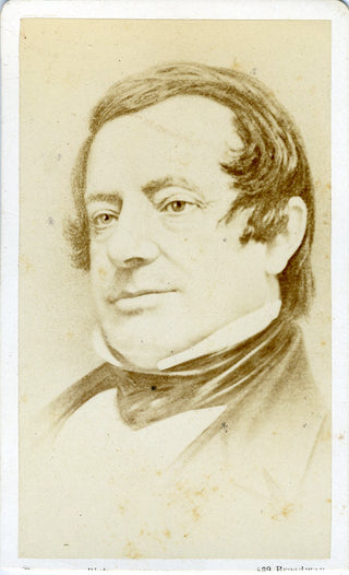 Irving, Washington. (1783–1859). Original CDV Photograph. An original carte de visite photograph portrait of the American short story writer, essayist, biographer, historian, and diplomat best known for his short stories "Rip Van Winkle" and "The Legend of Sleepy Hollow." A reproduction by George G. Rockwood of New York on the original mount, with a caption on the verso: "This Photograph is COPIED from another picture, and must not be taken as a sample of our work direct from life." Lower edge slightly trimmed obscuring the photographer's name and with some scattered spots; otherwise in fine condition. 2.5 x 4 inches (6.3 x 10.1 cm).