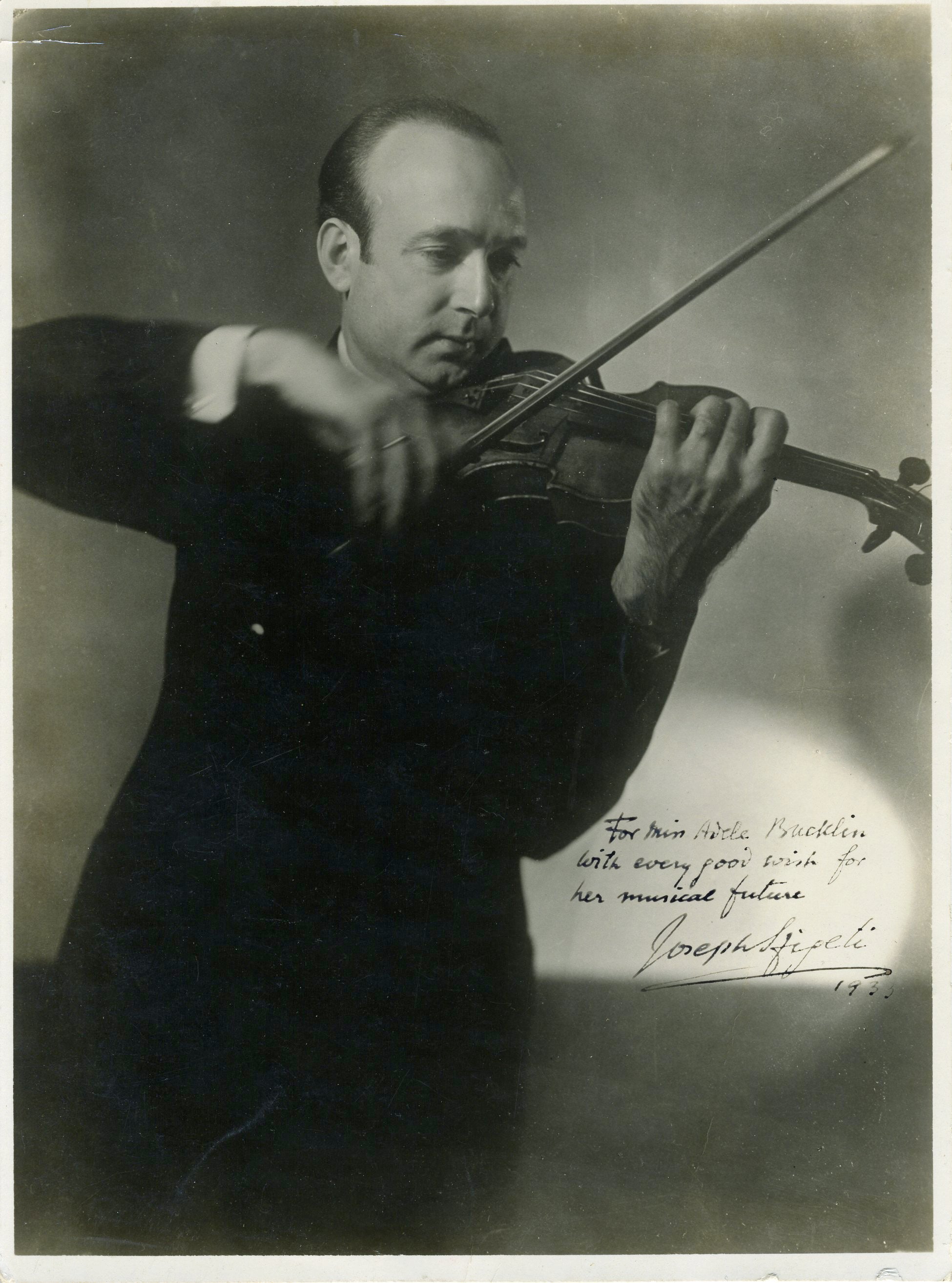 Signed photograph of the celebrated violinist, inscribed to a young violinist, Adele Bucklin "with every good wish for her musical future," boldly signed and dated 1933. A few scattered creases; overall in very good condition. 6.5 x 8.75 inches (16.6 x 22.4 cm).