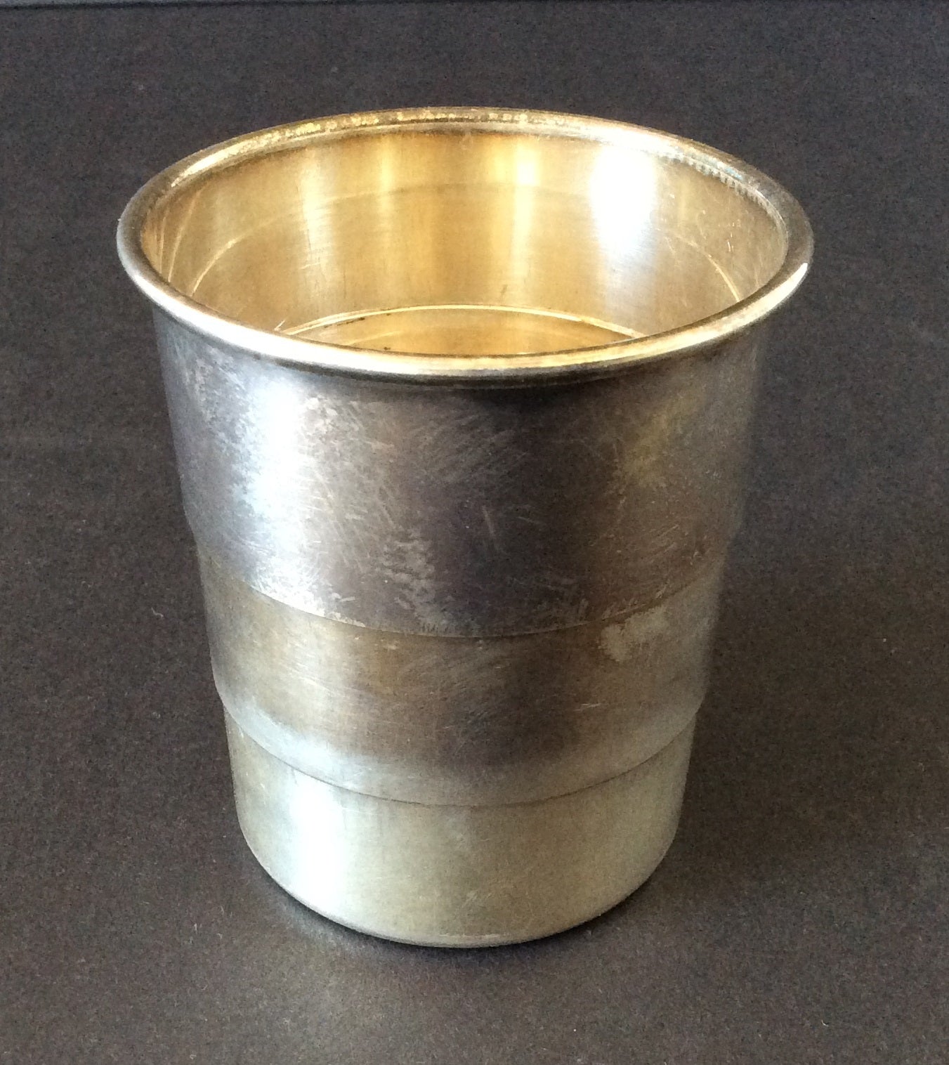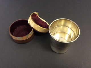 [Chopin, Frédéric. (1810–1849)] [Sand, George. (1804–1876)]. Folding Travel Cup. A remarkable and intriguing relic from the eminent French author, born Amantine-Lucile-Aurore Dupin, better known by the masculine pen name she adopted early in her career. An early feminist, she also earned a footnote in musical history as the longtime romantic companion of pianist/composer Frédéric Chopin.
