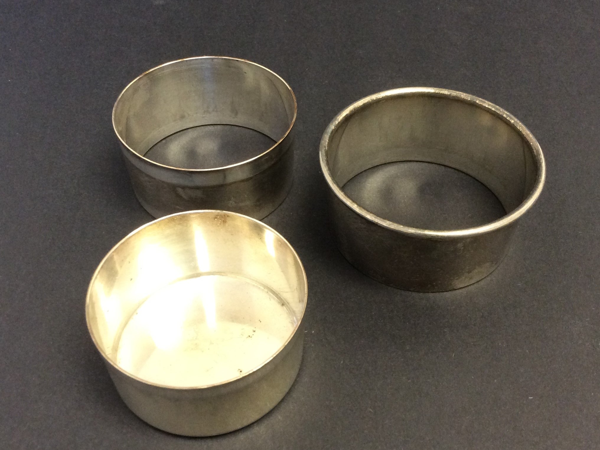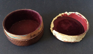 A folding goblet ingeniously constructed of a base and two nesting cylinders of silvered metal, contained in its original leather case. George Sand apparently traveled with this cup on her many voyages. The cup has some light tarnishing but is otherwise in fine condition; 3 inches (7.5 cm) tall when put together; 2.5 inches (6.5 cm) in diameter. The circular two-piece case, covered in leather and lined with red velvet, has significant losses to the lid and some wear to the outer leather; 2.75 inches (7 cm) in diameter.