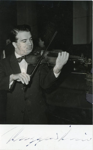 Signed photograph of the superb fiddler, specialist in the 19th century bravura repertory. A student of Persinger, Piastro and Kulenkampff, Ricci has been widely acclaimed for his technical prowess and was the first to record the 24 Paganini Caprices in their original version. Ricci is shown playing, ca. 1960's, and has signed below the image. One thumbprint; overall in very good condition. 3.5 x 5.5 inches (8.5 x 13.8 cm).