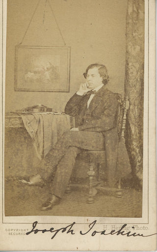 An early original signed H. Hering of London CDV portrait of the great Hungarian violinist, dedicatee of the Brahms Concerto and many other works. Joachim is shown as a young man, seated with his violin on the table next to him, a framed portrait of Stradivari on the wall over his shoulder. 3 x 4.5 inches. Upper edge slightly trimmed, else fine. An ideal example.