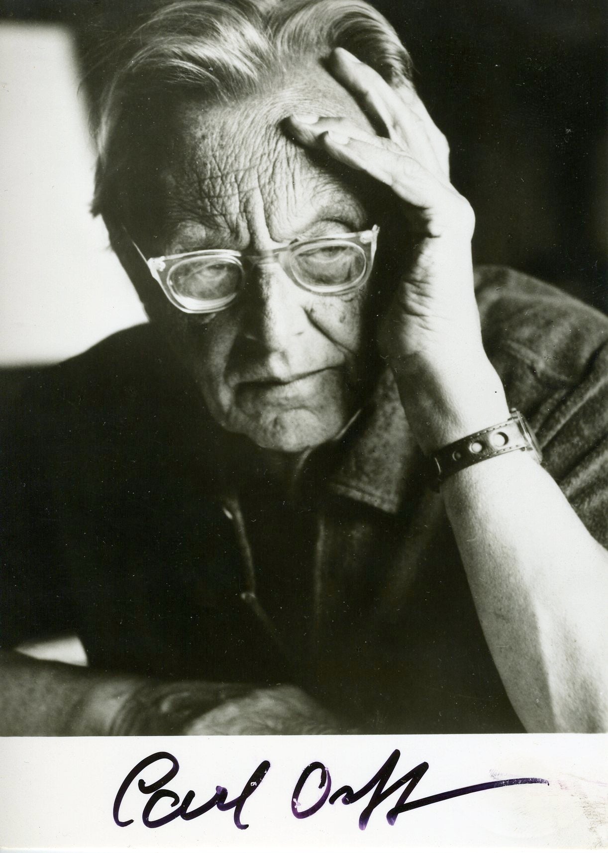 Orff, Carl. (1895-1982). Signed Photograph. Boldly signed original postcard photograph of the German composer, best known for his cantata Carmina Burana (1937) and his influential method of music education for children. The composer is shown in later life, and the postcard is dated on the verso: January 17, 1979. One slight smudge at the lower right; overall in fine condition. 4 x 5.75 inches (10.5 x 14.6 cm).