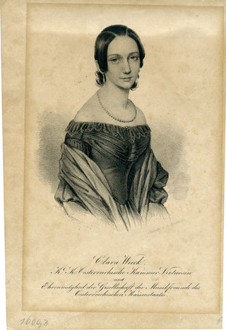 Schumann, Clara. (1819–1896). Lithograph Portrait. A lovely portrait of the great German pianist and composer, wife of Robert Schumann and famous muse of Johannes Brahms, described in the caption as "Clara Wieck, Chamber Virtuoso to the Austrian Court and Honorary Member of the Society of Friends of Music of the Austrian Empire." She shown as a young woman ca. 1838, having earned these titles after dazzling audiences in Vienna at age 18. Still known as Clara Wieck, she would marry Robert Schumann three years later in 1841.