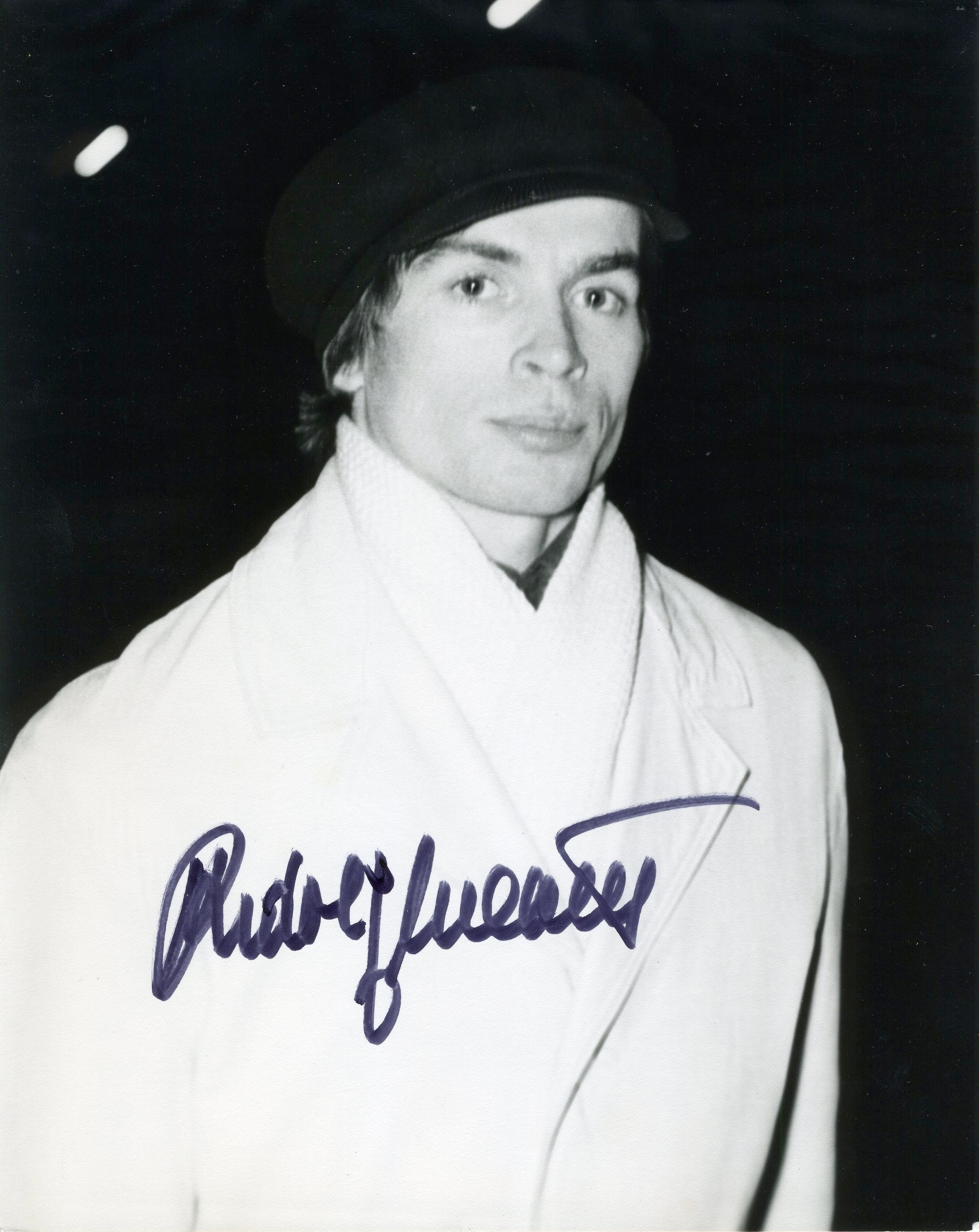 Signed richly printed black and white photograph of the great dancer, looking handsome in a winter coat and cap. He has signed boldly in black marker across the bottom half of the image. Photographed by Edward Griffiths, with the photographer's stamp on the verso. In very fine condition. 8 x 10 inches (20.2 x 25.3 cm).