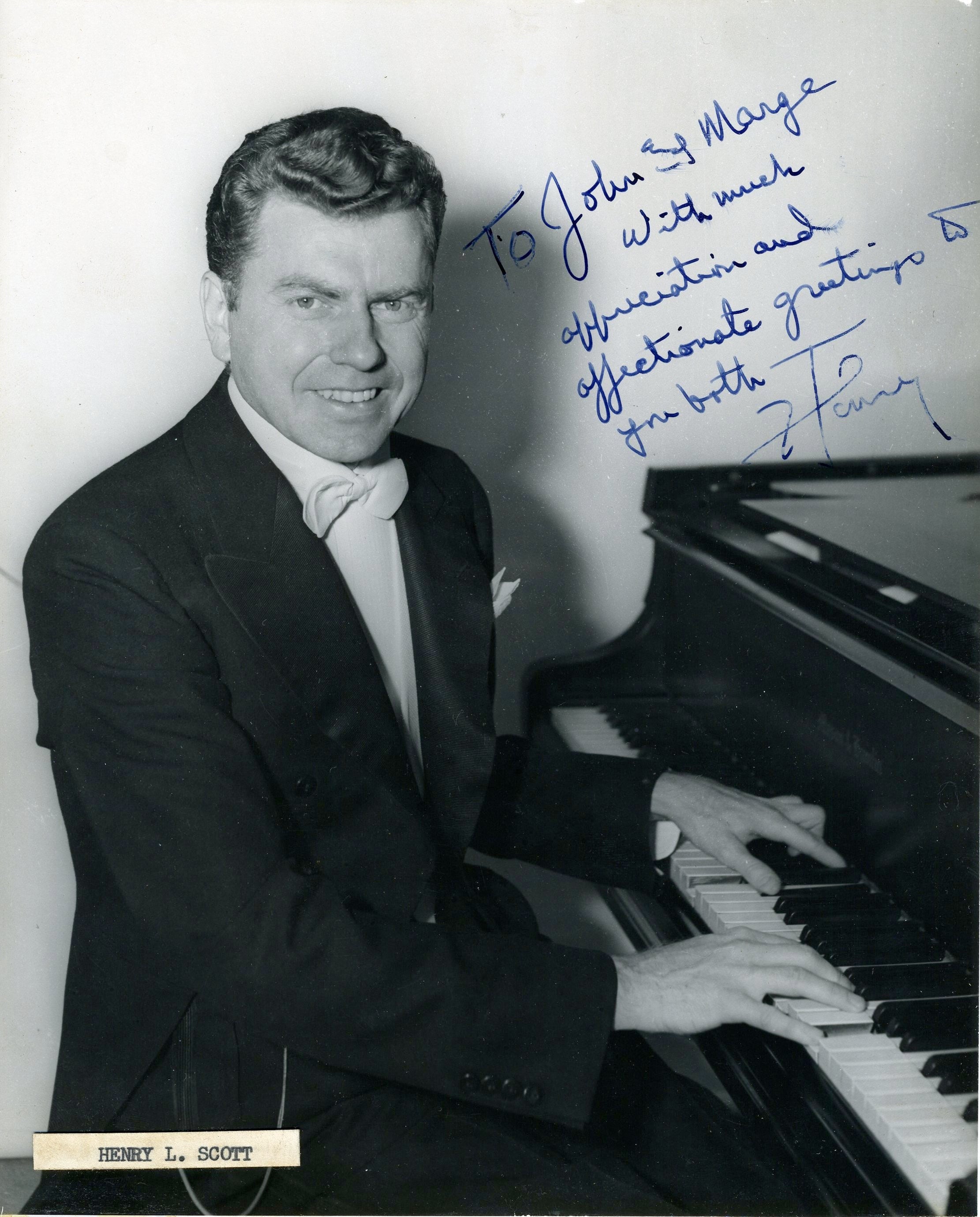 Signed photograph of the comedian-pianist who was popular in the 1950's and known for his comic song "The little upright piano who wanted to play for the King." In fine condition. 7.5 x 9.25 inches (19 x 23.5 cm).