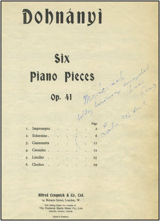 Dohnányi, Ernö. (1877–1960). Six Piano Pieces, Op. 41. SIGNED. London: Alfred Lengnick & Co. . 1947. First edition.