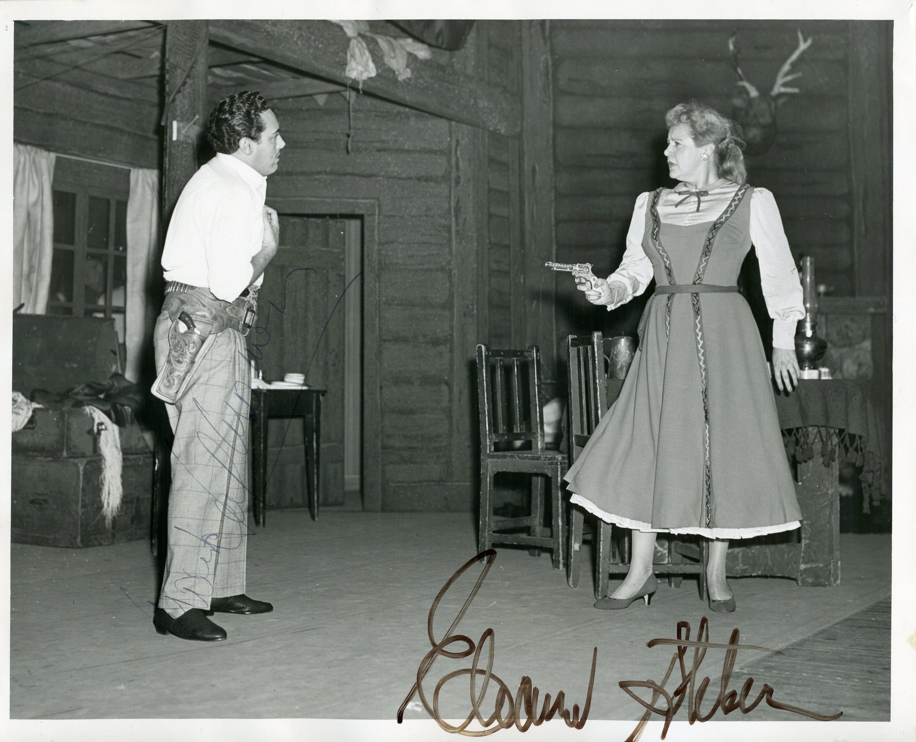Steber, Eleanor. (1914–1990) & Monaco, Mario del. (1915–1982). Signed Photograph in La Fanciulla del West. Original signed photograph of the important American soprano in her role in La Fanciulla del West, pointing a gun at her costar, the Italian tenor and so-called "Brass Bull of Milan." Both Steber and Monaco have signed the image, Steber especially boldly. Photographed by Victor Saxl for the Chicago Sun-Times. Mounting remnants on the verso; otherwise in very fine condition. 10 x 8 inches (25.3 x 20.5 cm).