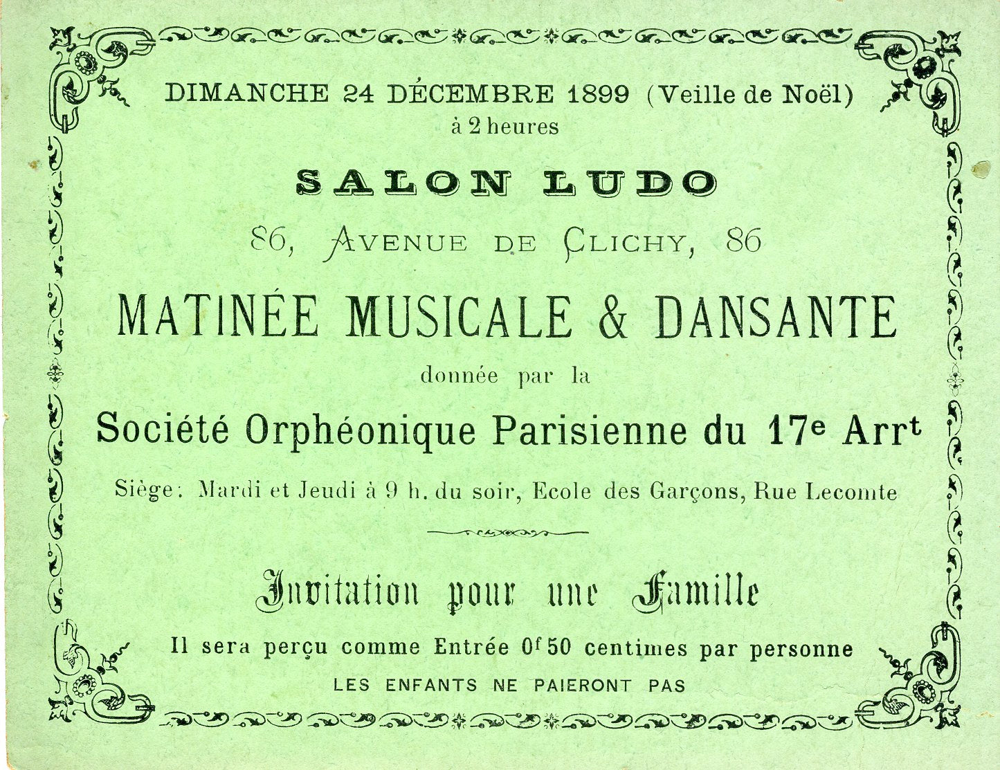 Original ticket to a Christmas Eve matinée concert and dance performance given by the Société Orphéonique Parisienne du 17e Arrondissement on December 24, 1899. The concert took place at the Salon Ludo in Paris. An attractively designed invitation in fine condition. 4.75 x 3.75 inches (12.3 x 9.6 cm).