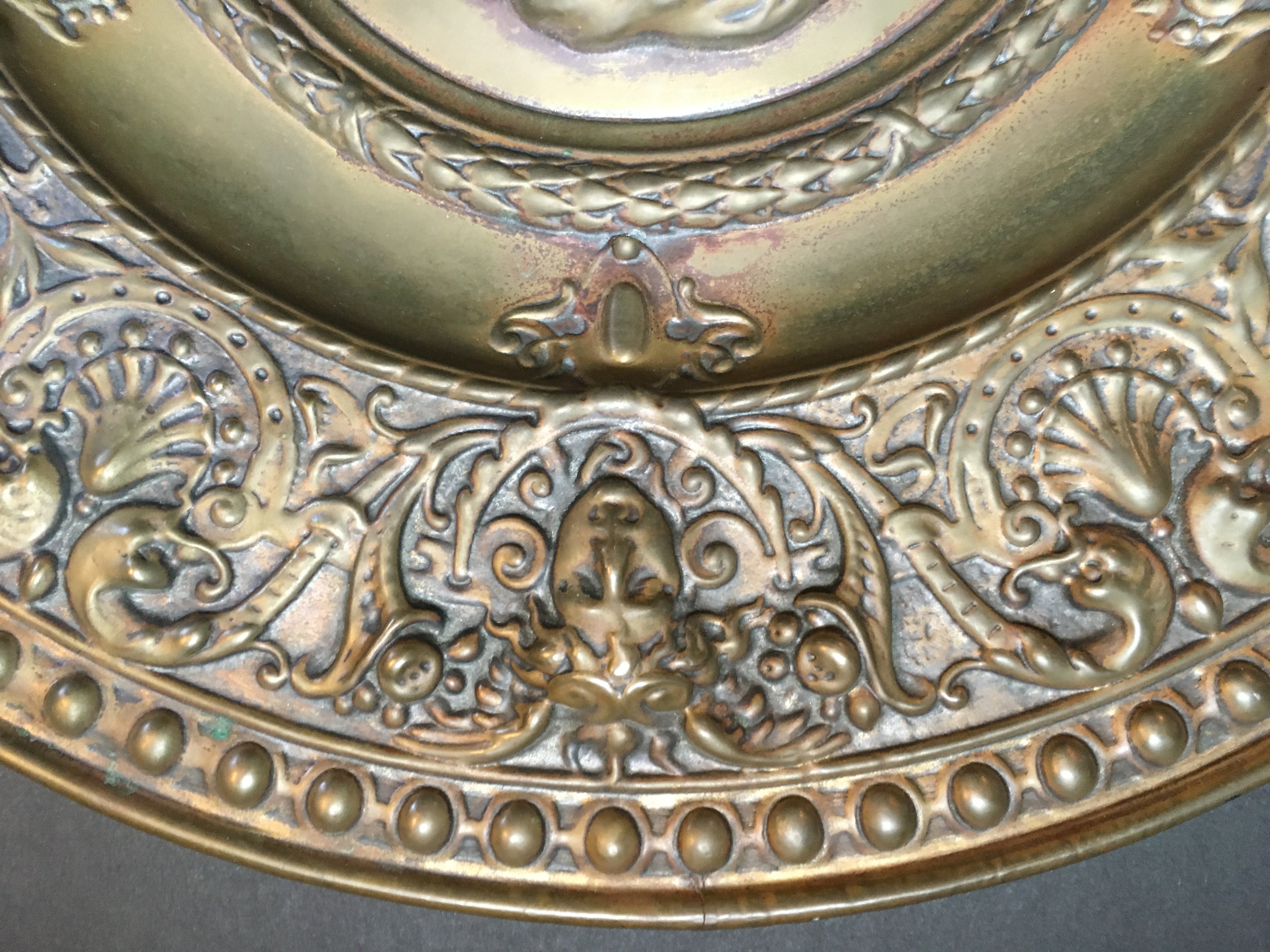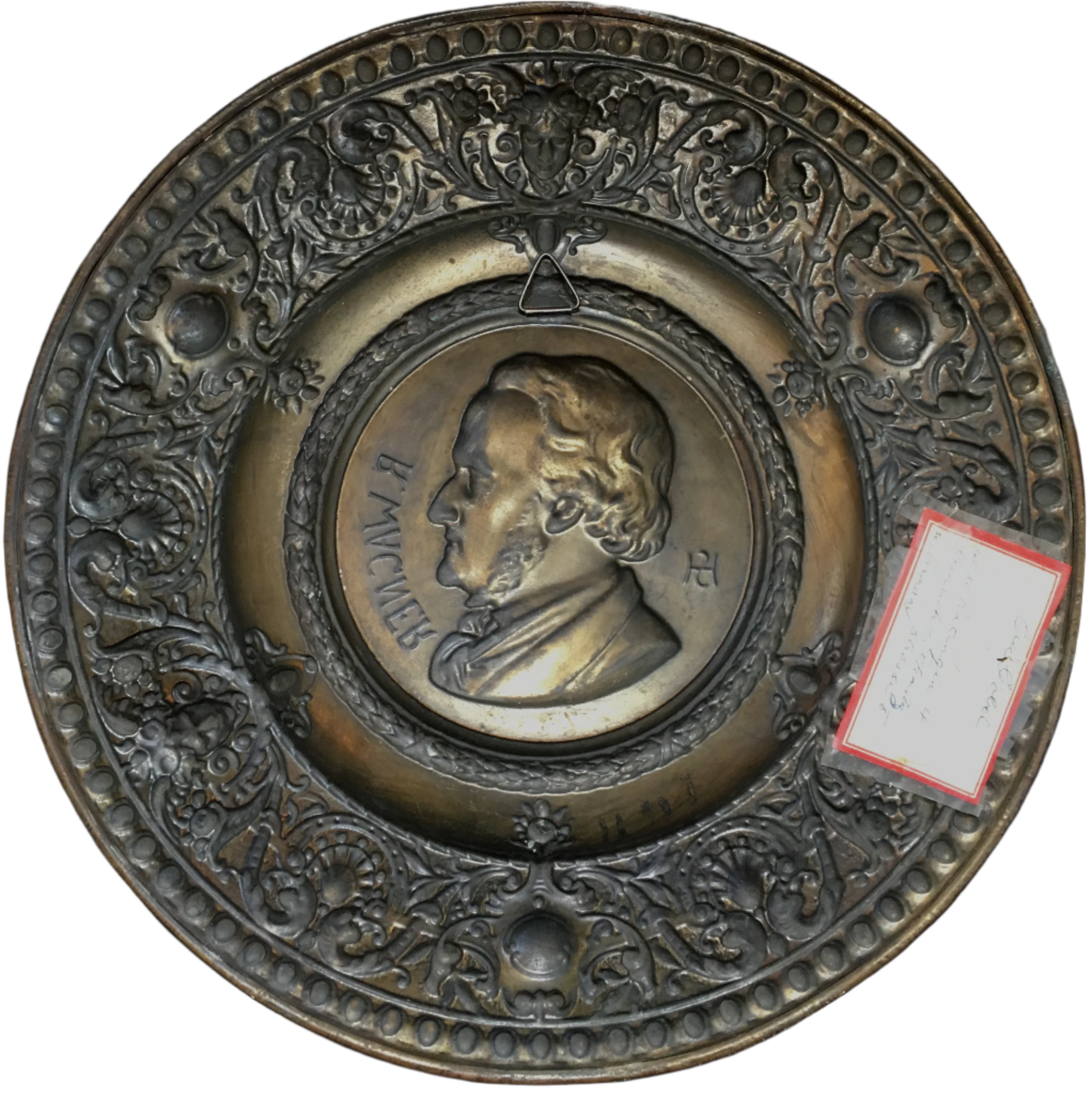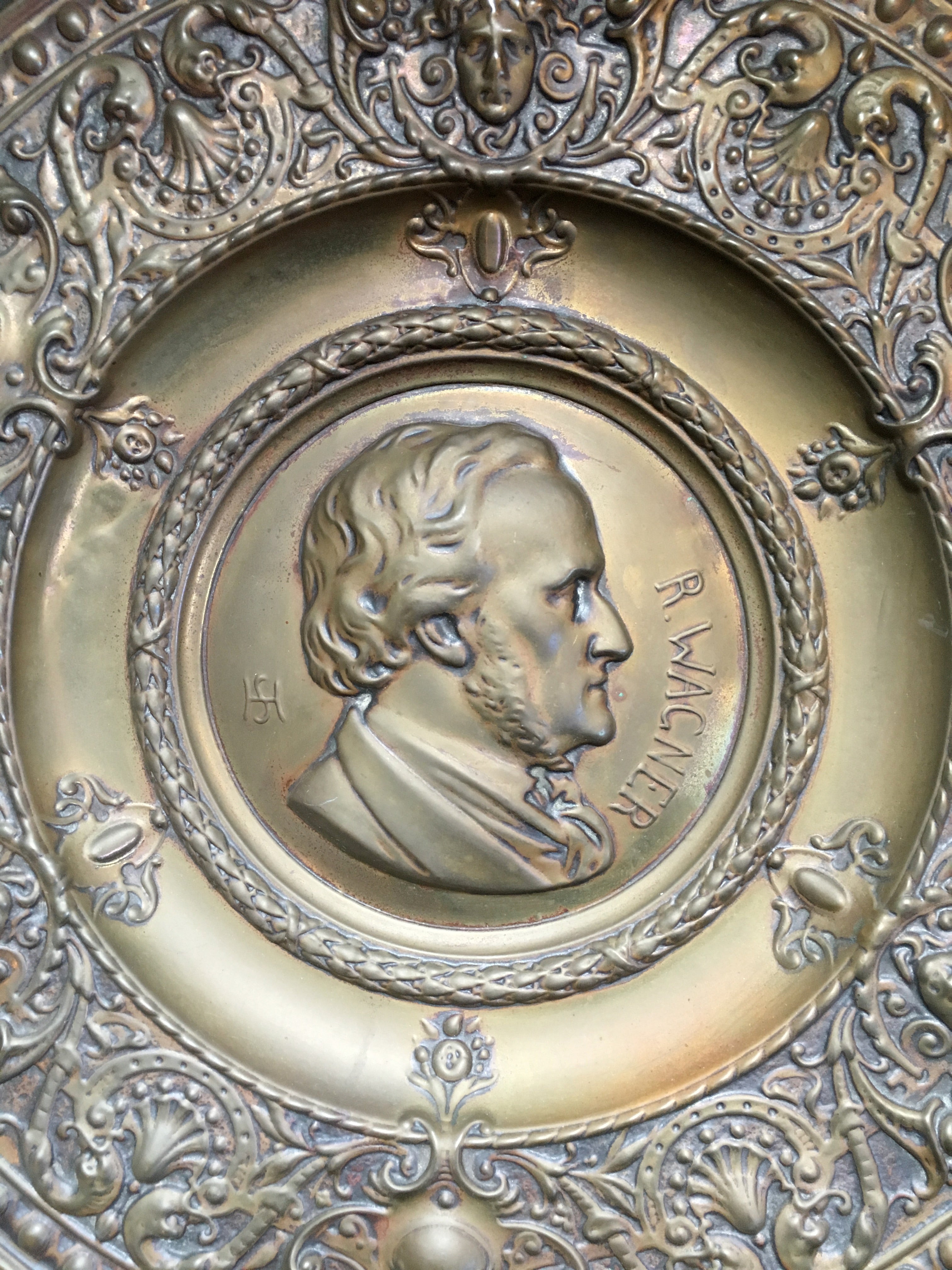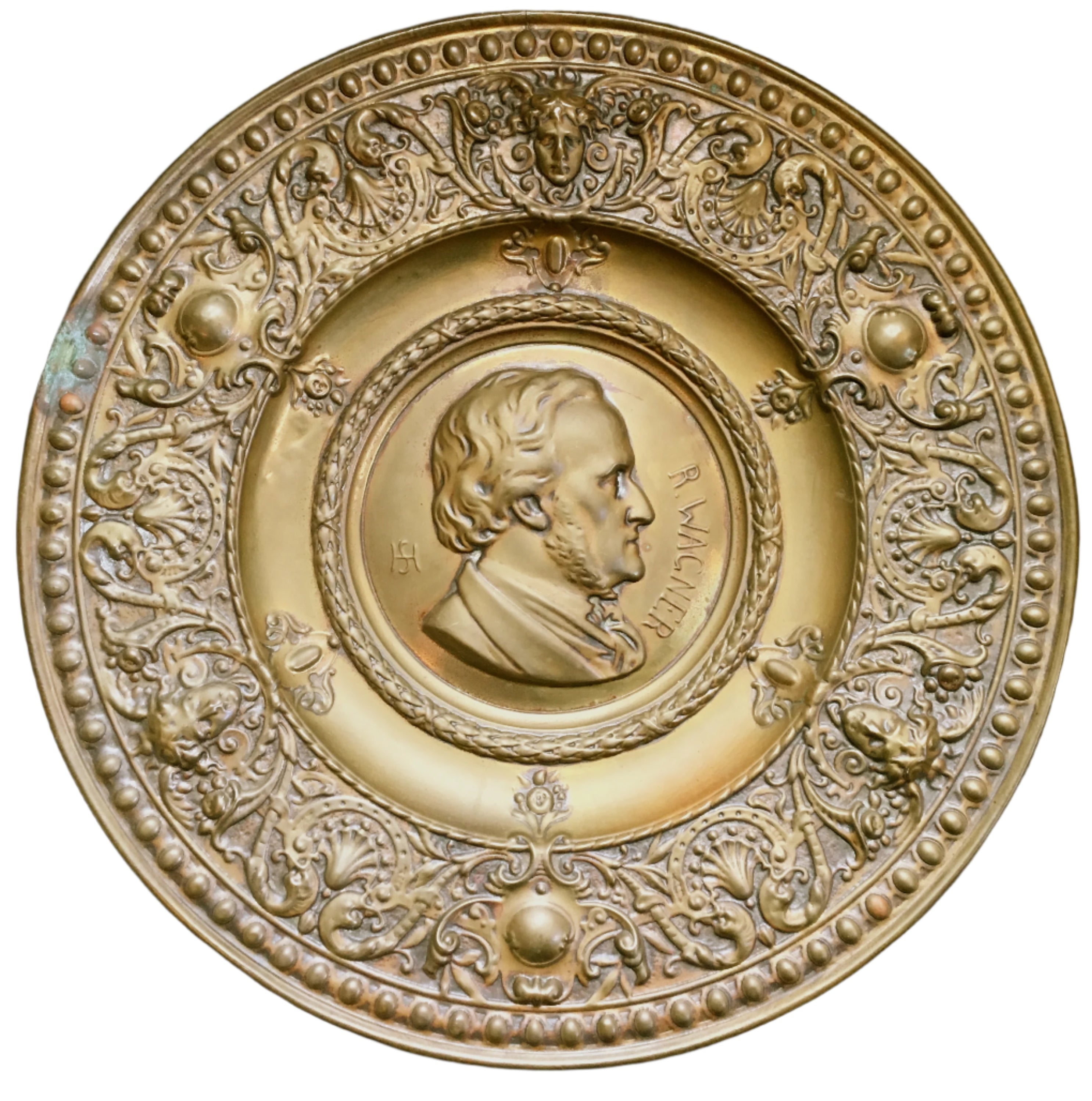 Large commemorative metal plate, ca. 1900, honoring the composer. Signed with an unidentified monogram HS, the composer right facing bust portrait encircled in garland and in an elaborate decorative outer border of heads and twisting vines. Hanging hardware on verso, a little tarnished in places, but overall very striking indeed. 17 inches [43 cm] in diameter.