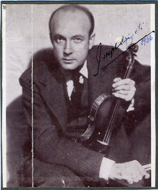 Szigeti, Joseph. (1892–1973). Signed Halftone Photograph. Halftone photograph of the great Hungarian violinist, signed at the right and dated (apparently in another hand) 1936. Clipped from a program and mounted on black card. One vertical crease; slightly irregularly trimmed; overall in very good condition. Please note that the image appears much less pixelated in person than it does in our high resolution scan! 4 x 5 inches (10.5 x 12.5 cm).