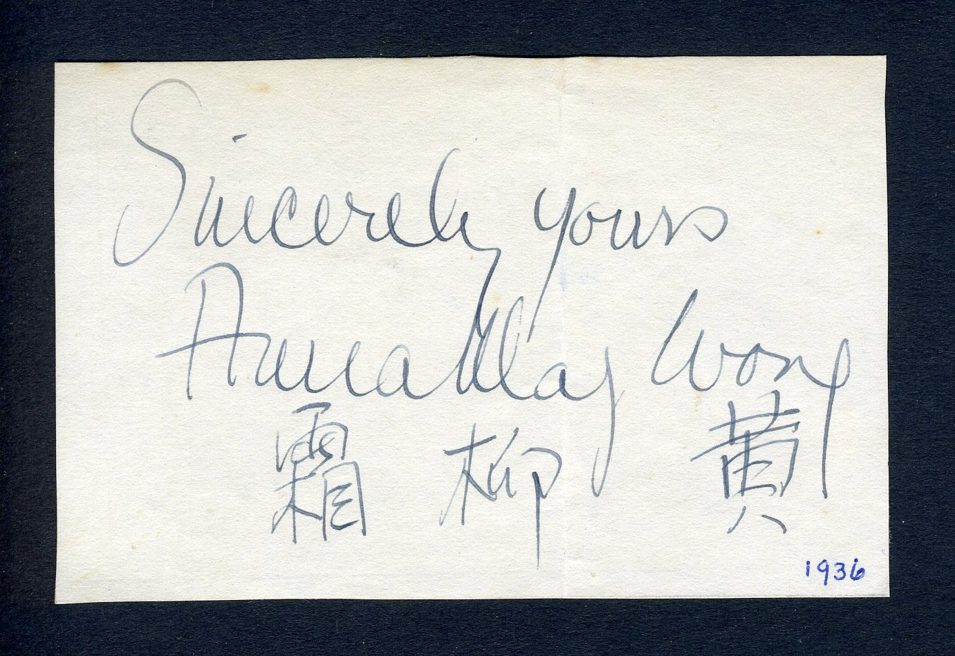 Wong, Anna May. (1905 - 1961). Autograph Signature in Chinese and English. An original autograph signature from the Chinese-American actress in English and Chinese characters, dated 1936 in another hand. One vertical crease, slight mounting remnants on the verso; overall in fine condition. 4 x 2.5 inches (10.2 x 6.6 cm).