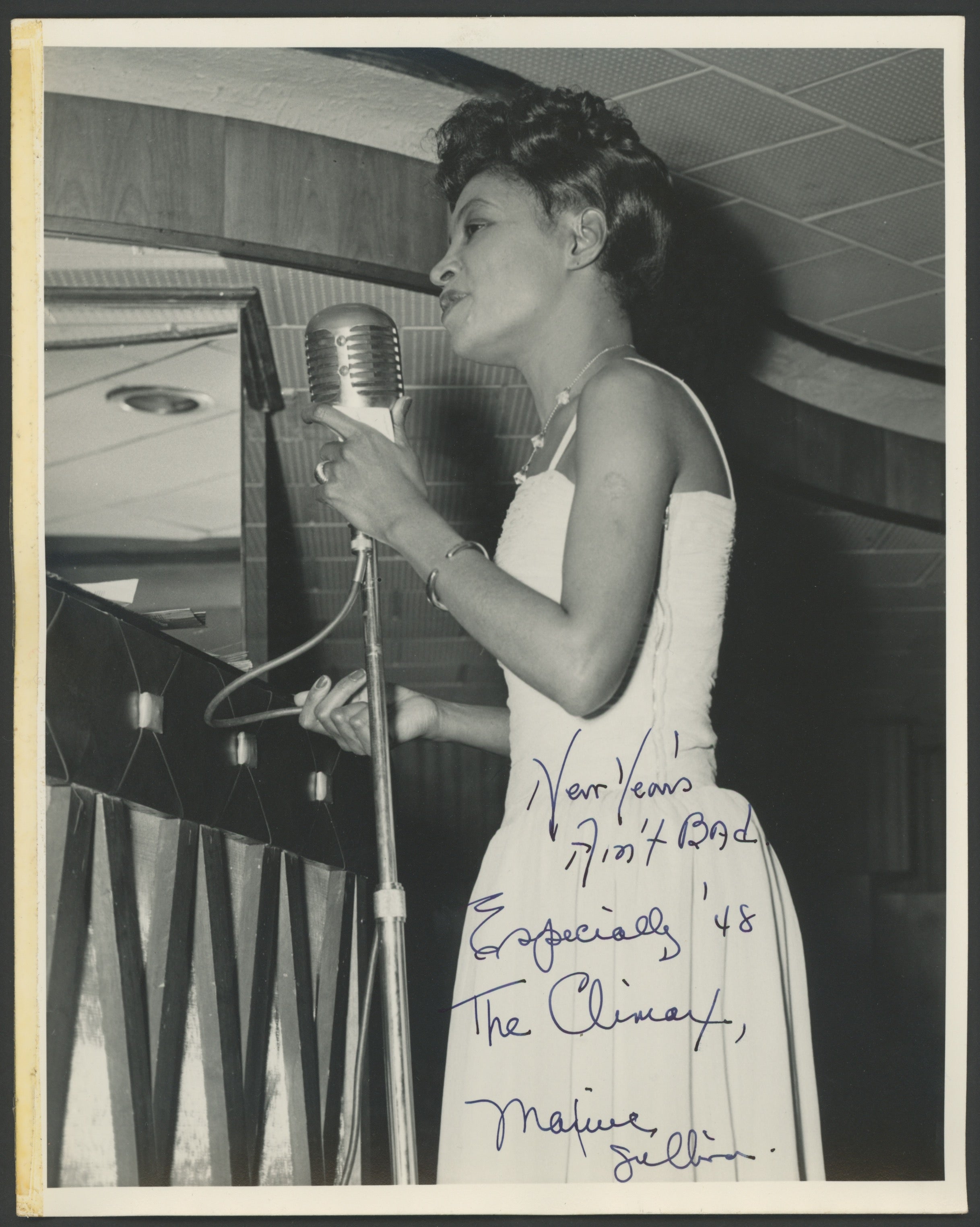 Sullivan, Maxine. (1911-1987). Signed Photograph from New Year's 1948. Original doubleweight photograph of the American jazz vocalist and performer, signed and inscribed boldly in blue ink "New Year's Ain't Bad Especially '48 The Climax Maxine Sullivan." 8 x 10 inches. Tape remnants along the left edge, else fine.