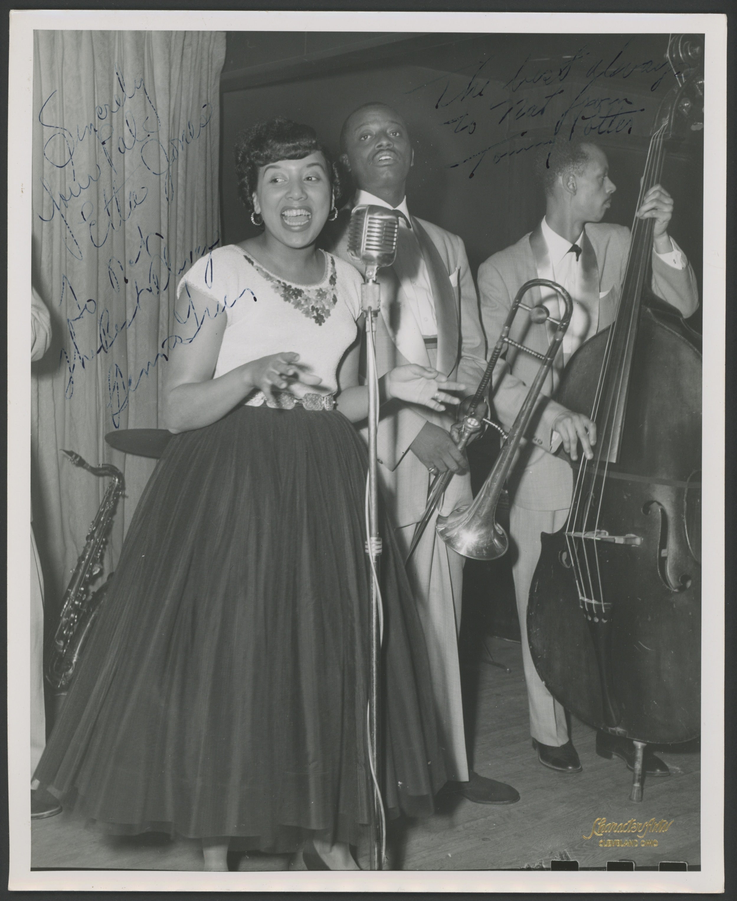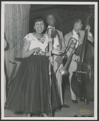 Jones, Etta. (1928-2001) & Green, Bennie. (1923 - 1977) & Potter, Tommy. (1918 - 1988). Signed Photograph. Ebullient original Character Arts of Cleveland photograph of the American jazz vocalist and performer Etta Jones, the sensational jazz trombonist Bennie Green and the important jazz bass player Tommy Potter best known for having been a member of Charlie Parker's "classic quintet," with Miles Davis, between 1947 and 1950. Boldly signed and inscribed by each in blue ink. 8 x 10 inches and in fine condition.